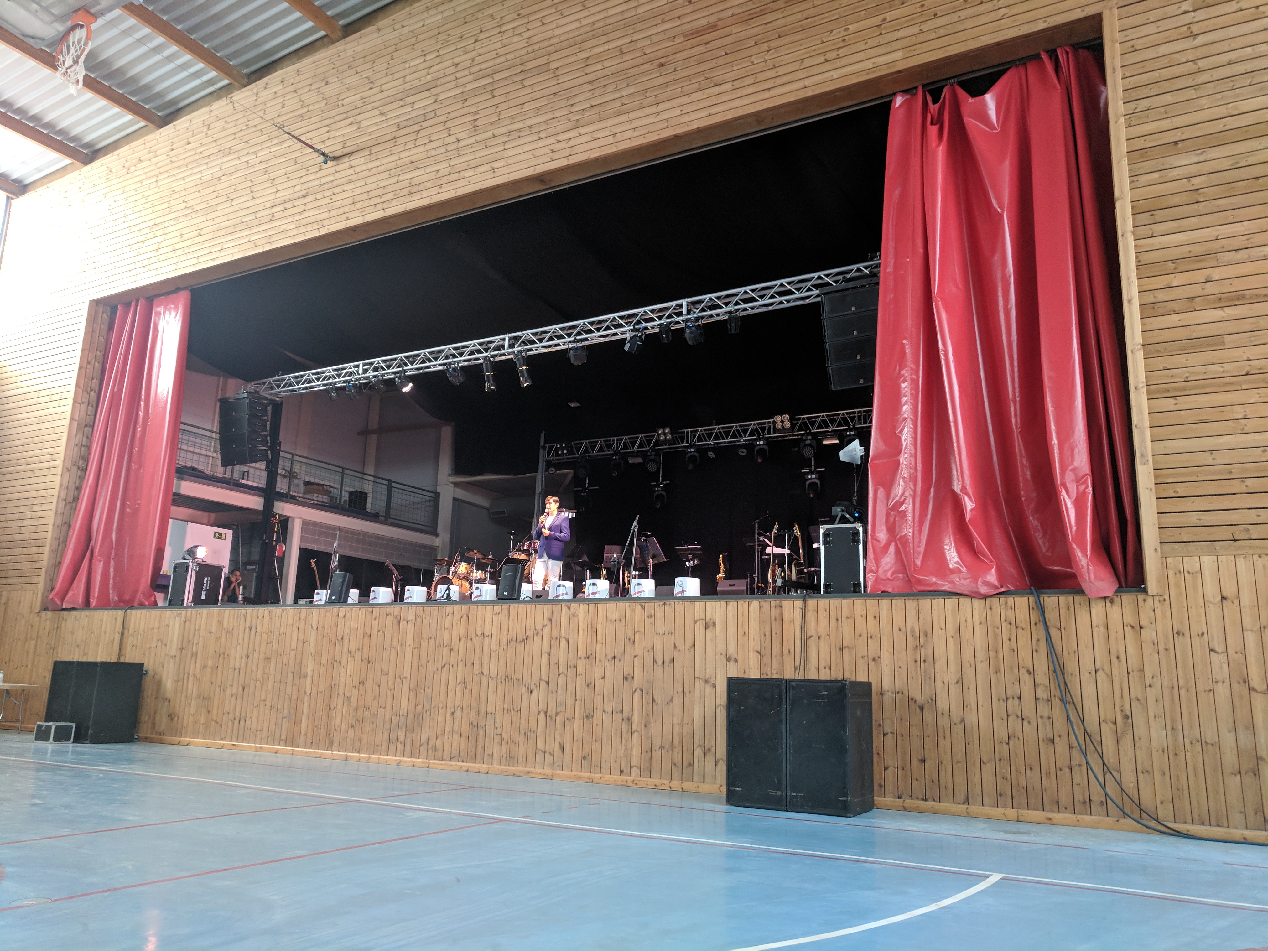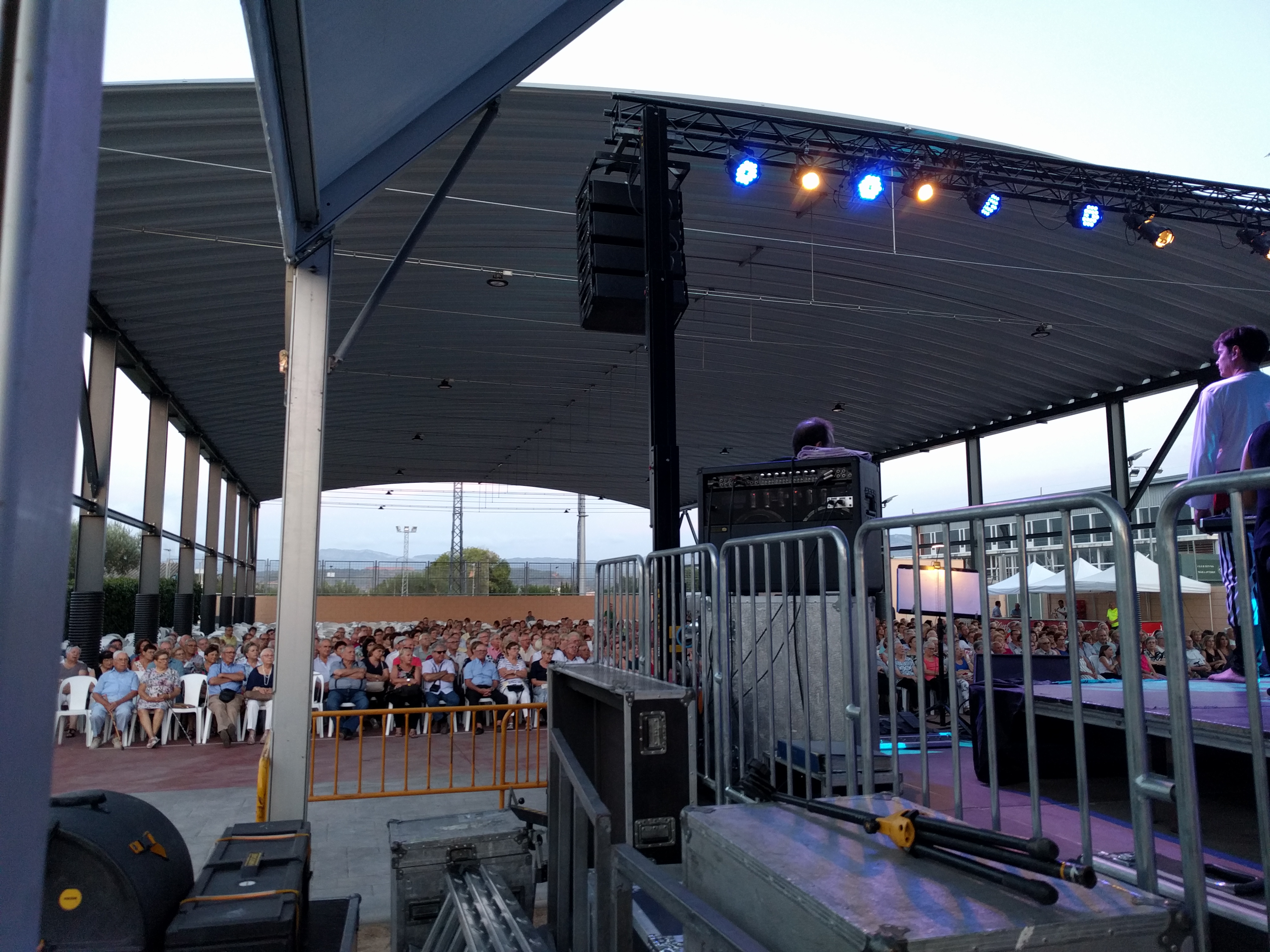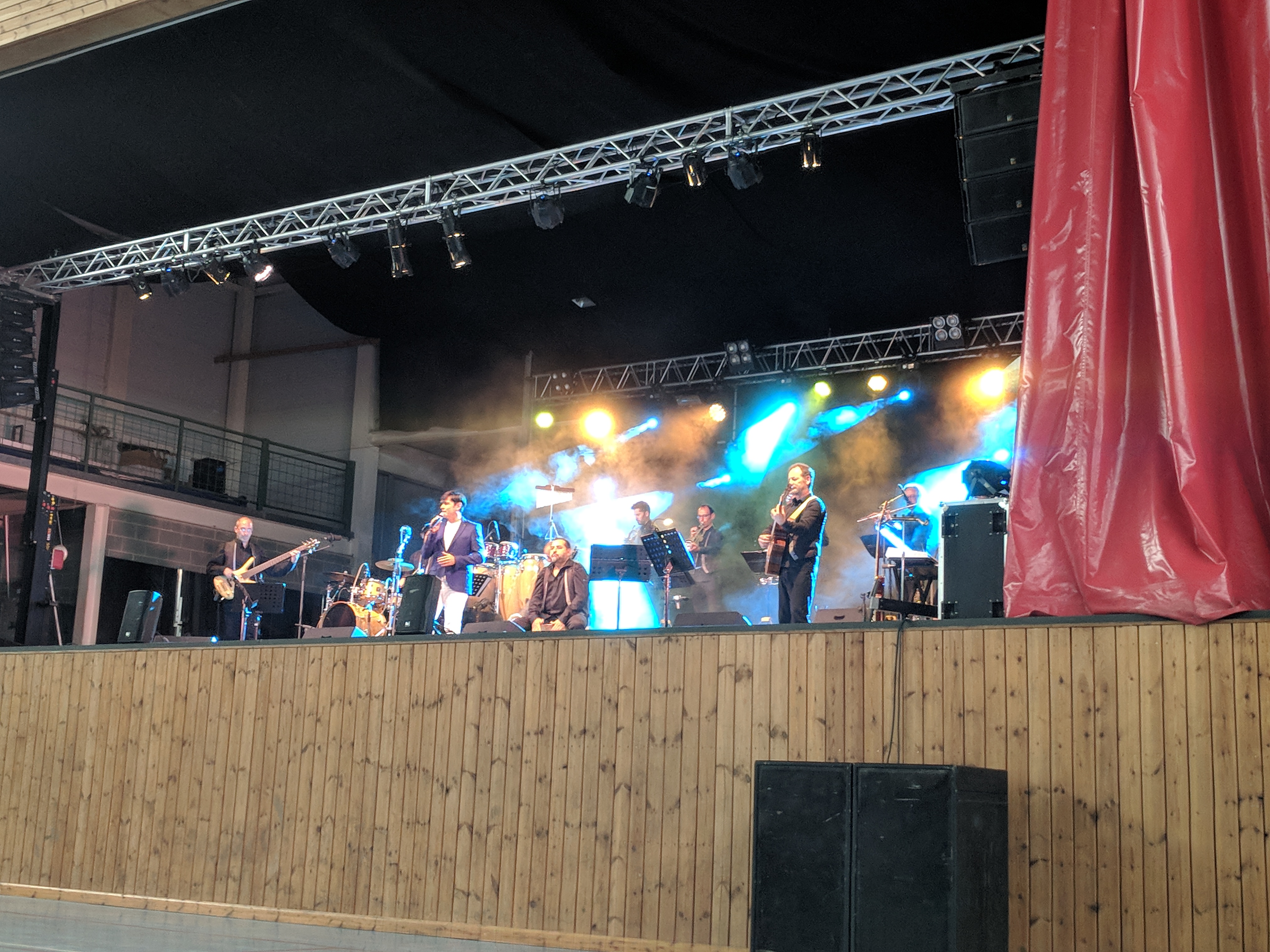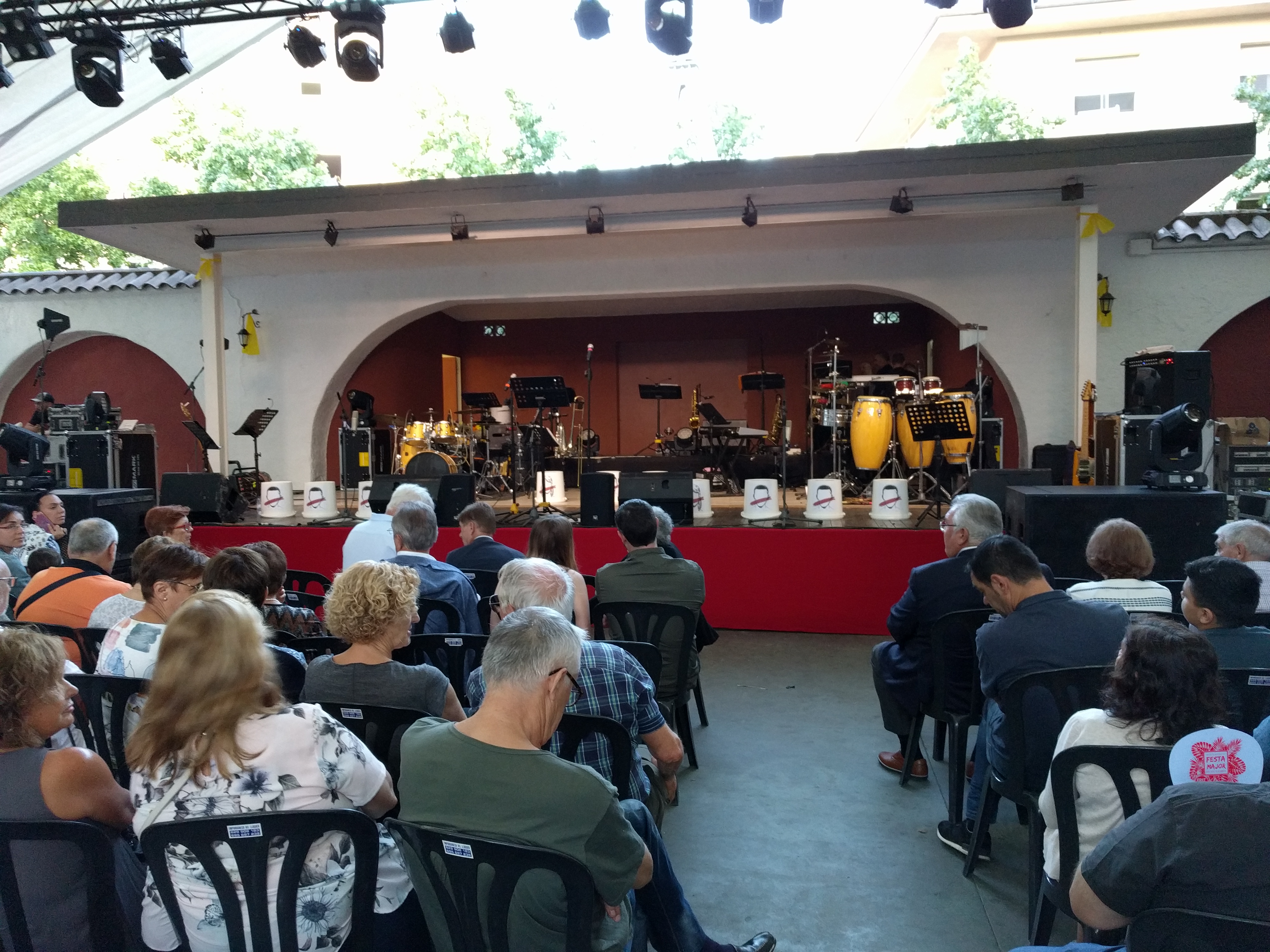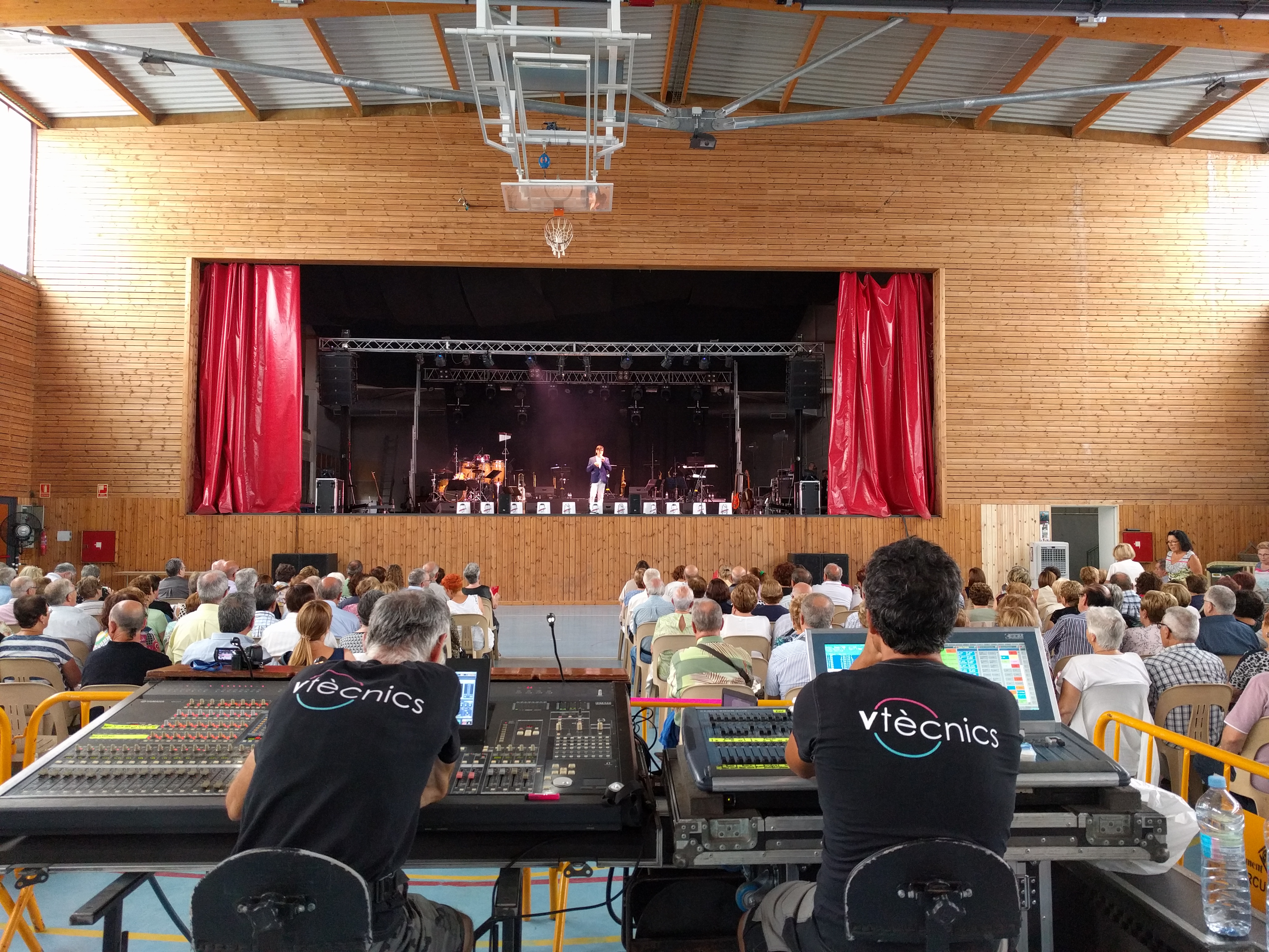 Acostumats als grans espais oberts, o a pavellons moderns, on muntem escenaris gegants, aquí no es podia fer gaire cosa, amb prou feina pots muntar l’estructura que aguanta els altaveus i els llums. I l’orquestra, acostumada a escenaris de 100 m²,  col·locada en una disposició nova i enclavadeta dalt el petit escenari 🙂