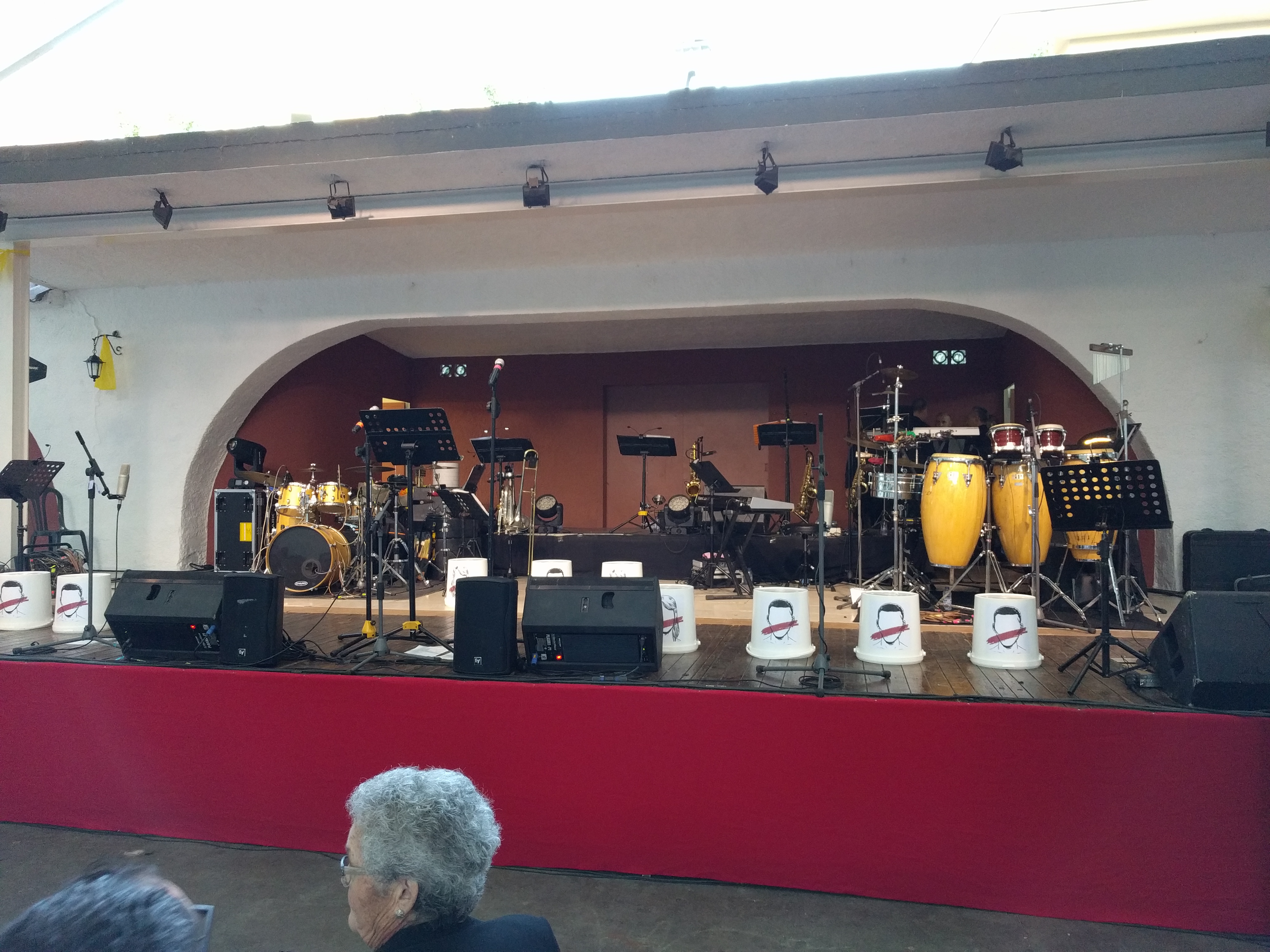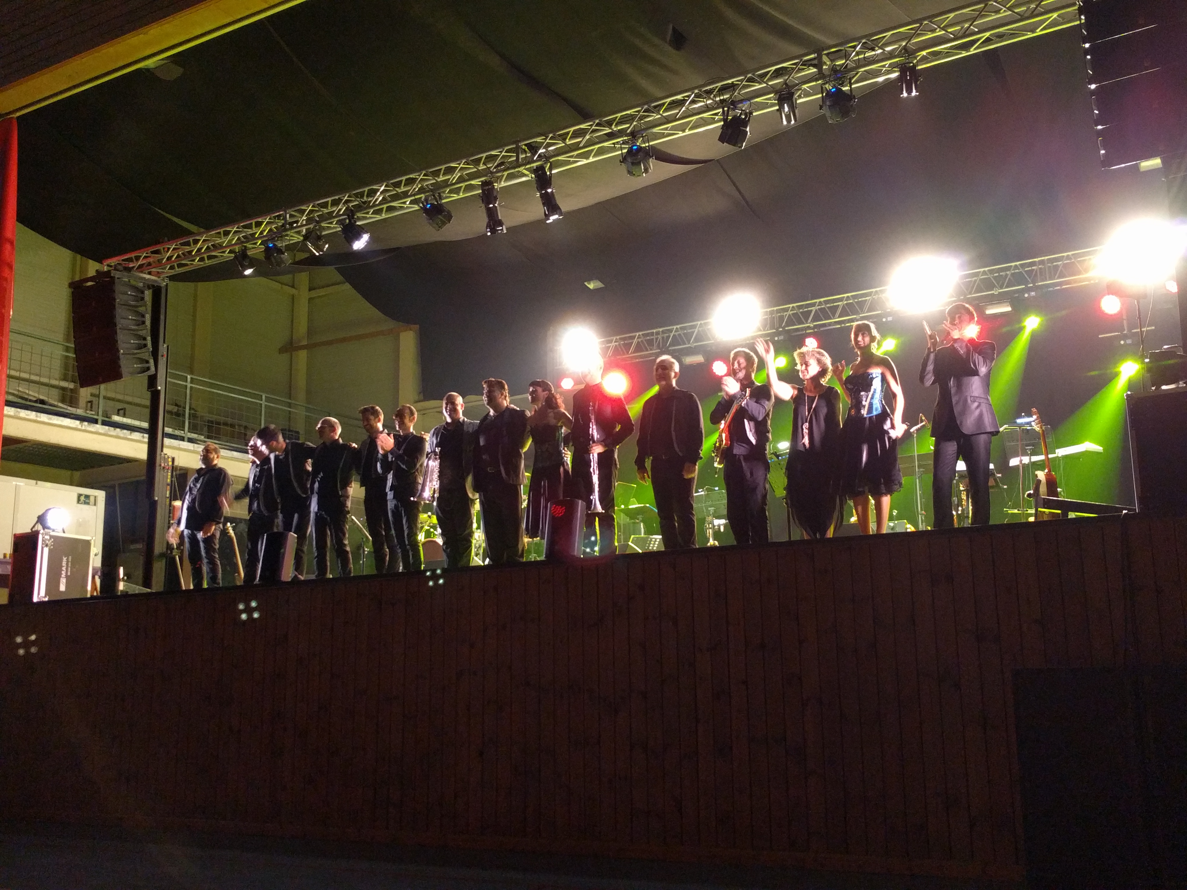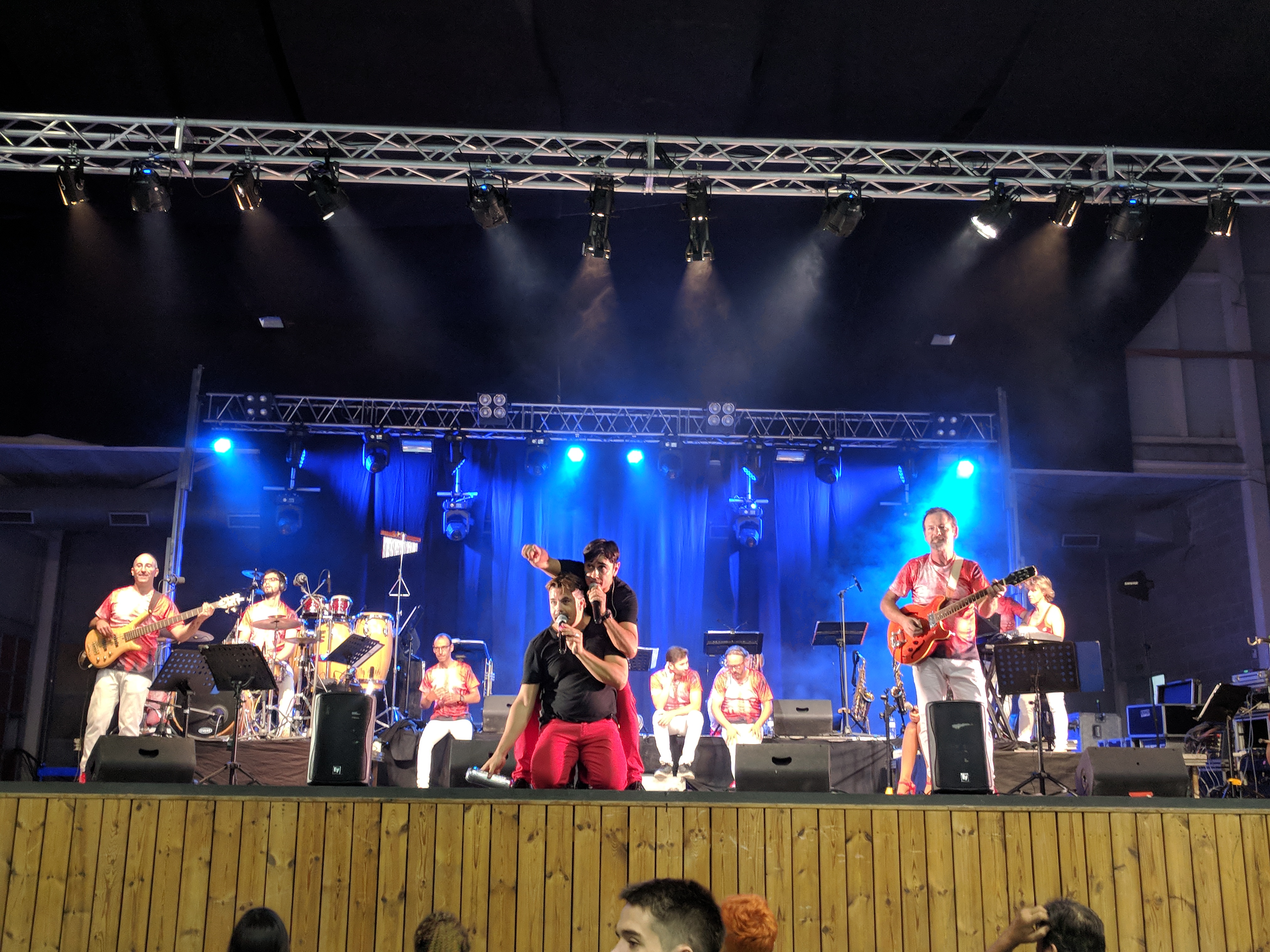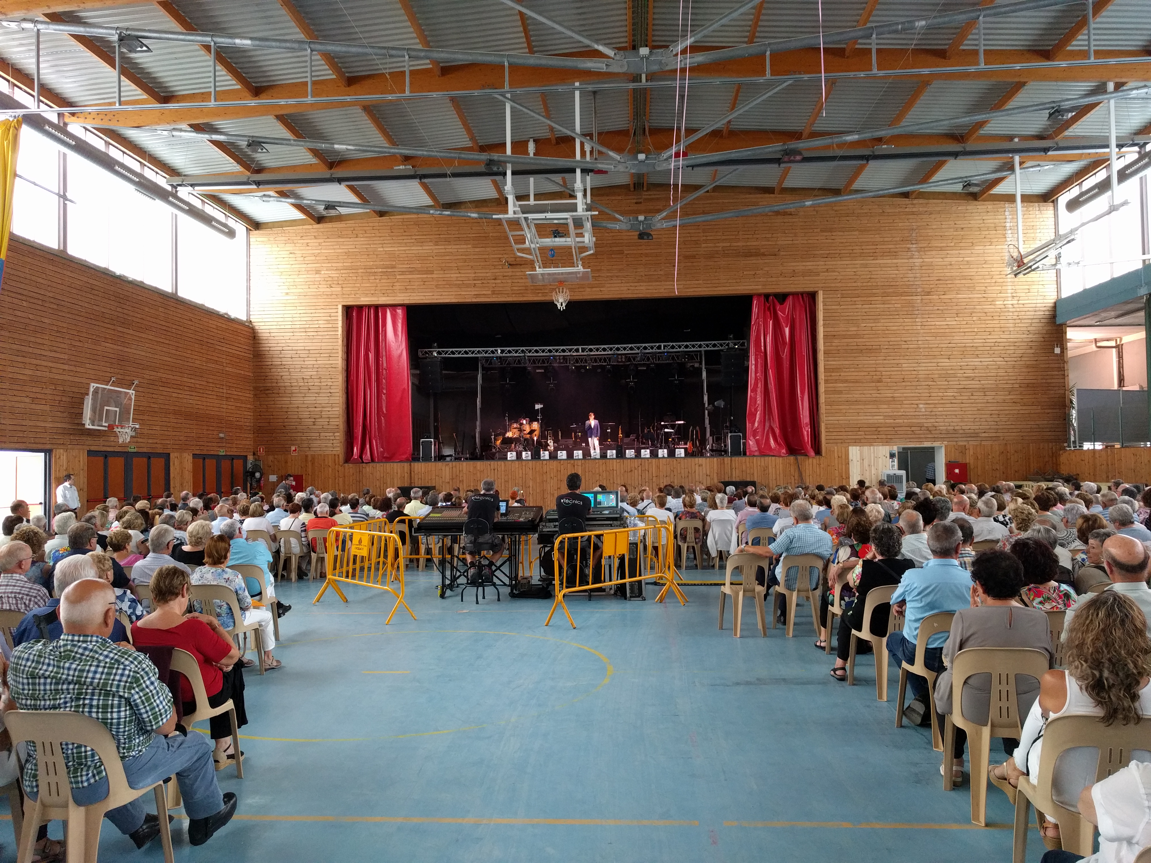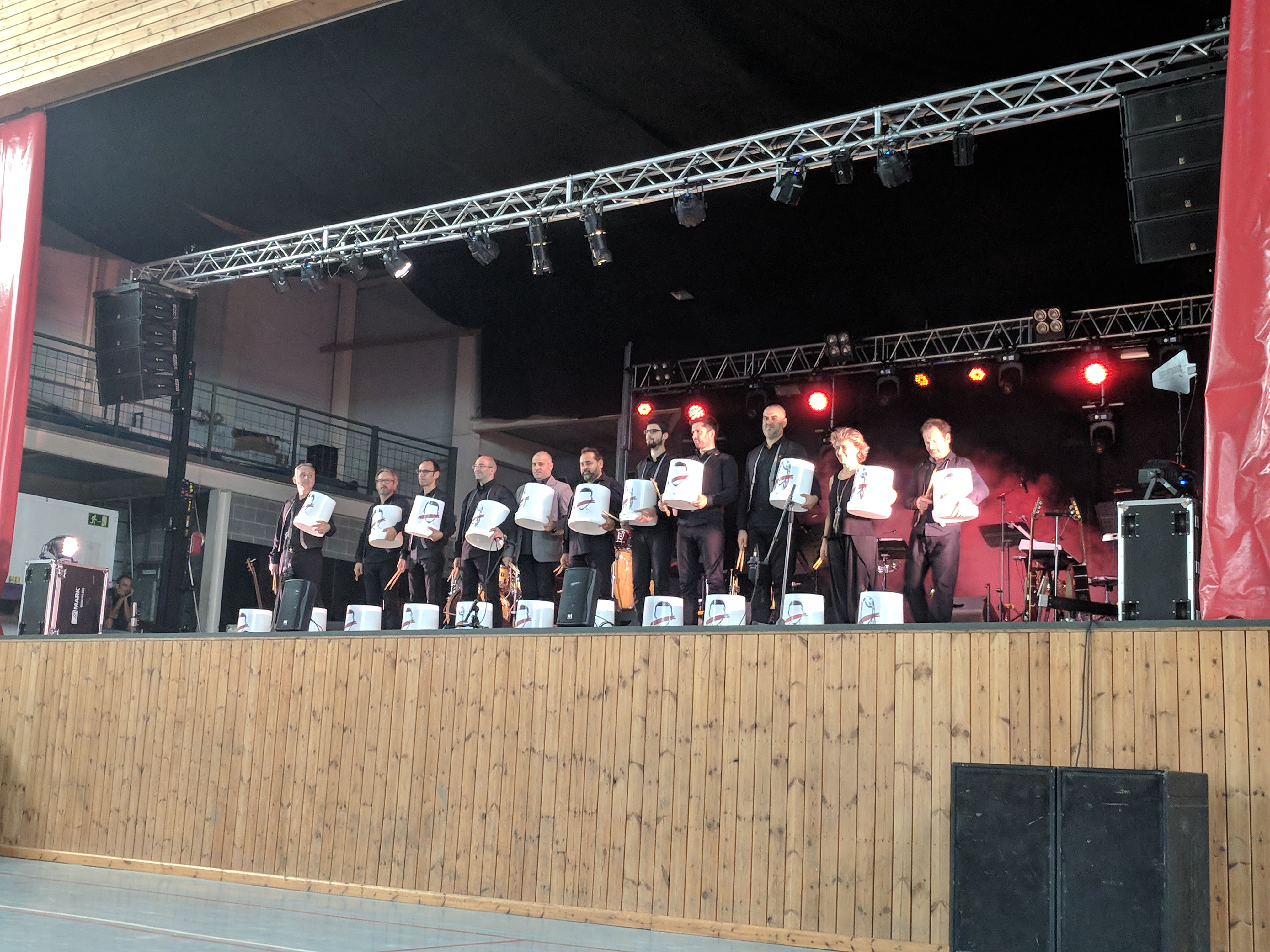 Acostumats als grans espais oberts, o a pavellons moderns, on muntem escenaris gegants, aquí no es podia fer gaire cosa, amb prou feina pots muntar l’estructura que aguanta els altaveus i els llums. I l’orquestra, acostumada a escenaris de 100 m²,  col·locada en una disposició nova i enclavadeta dalt el petit escenari 🙂