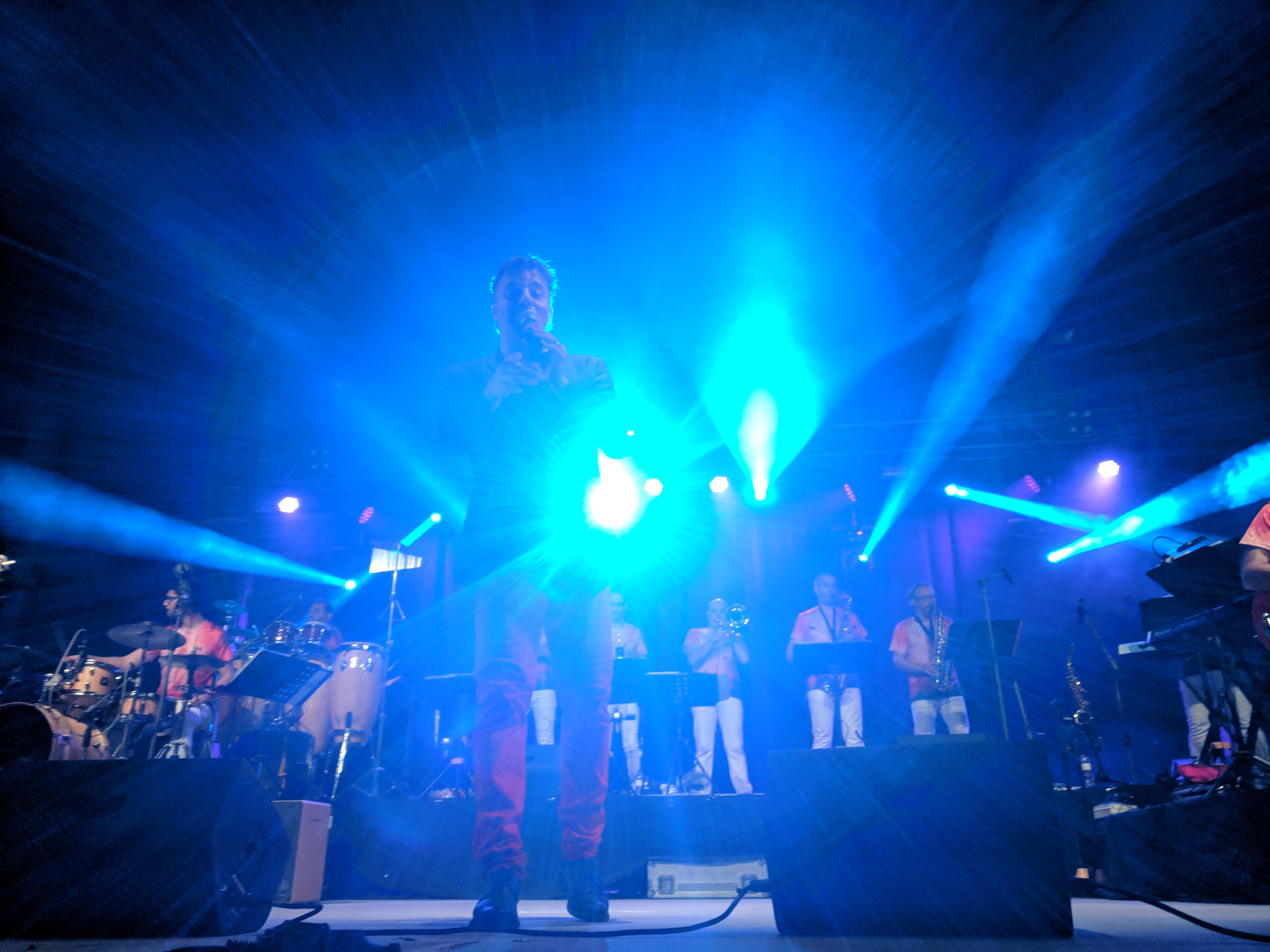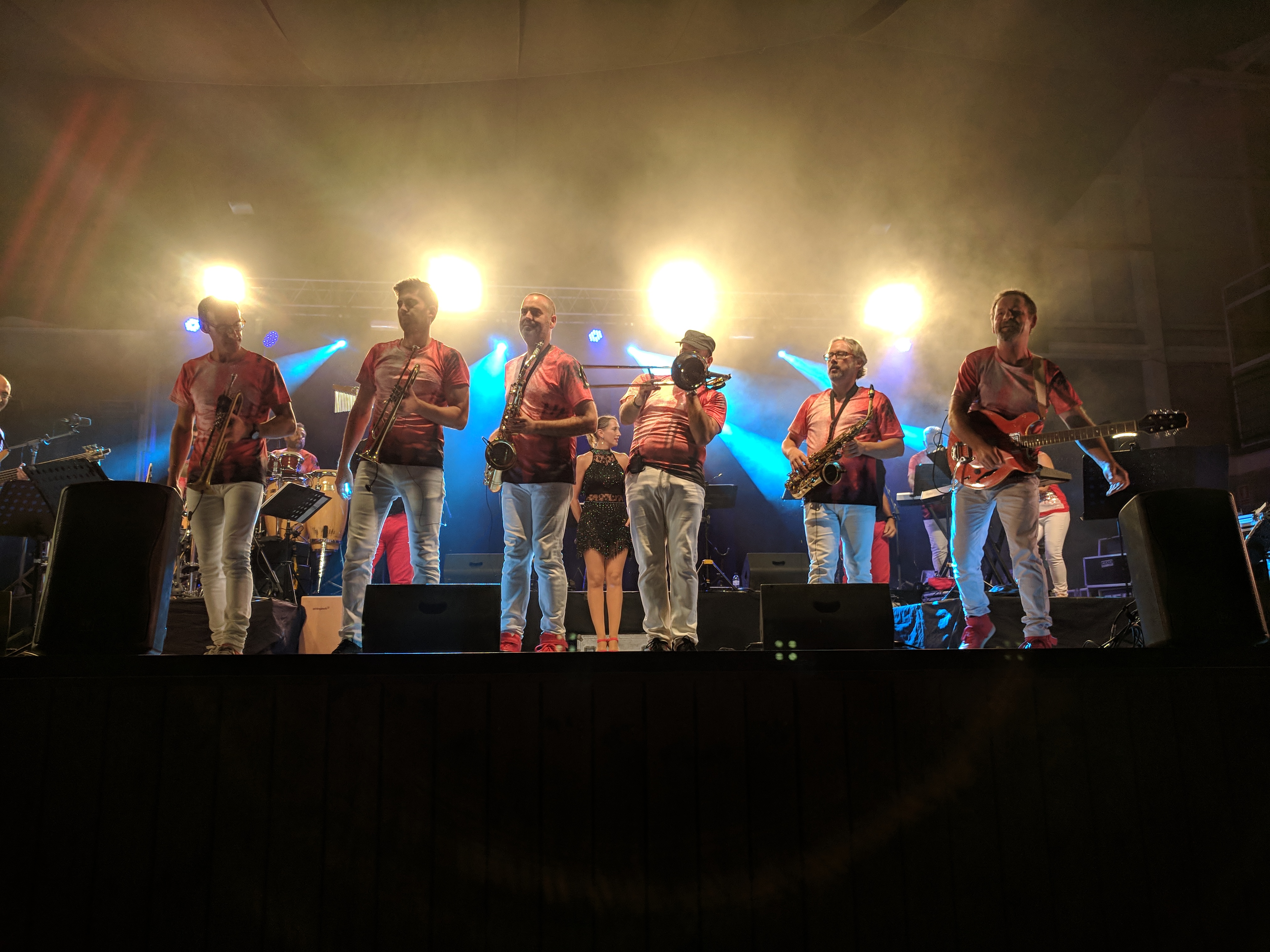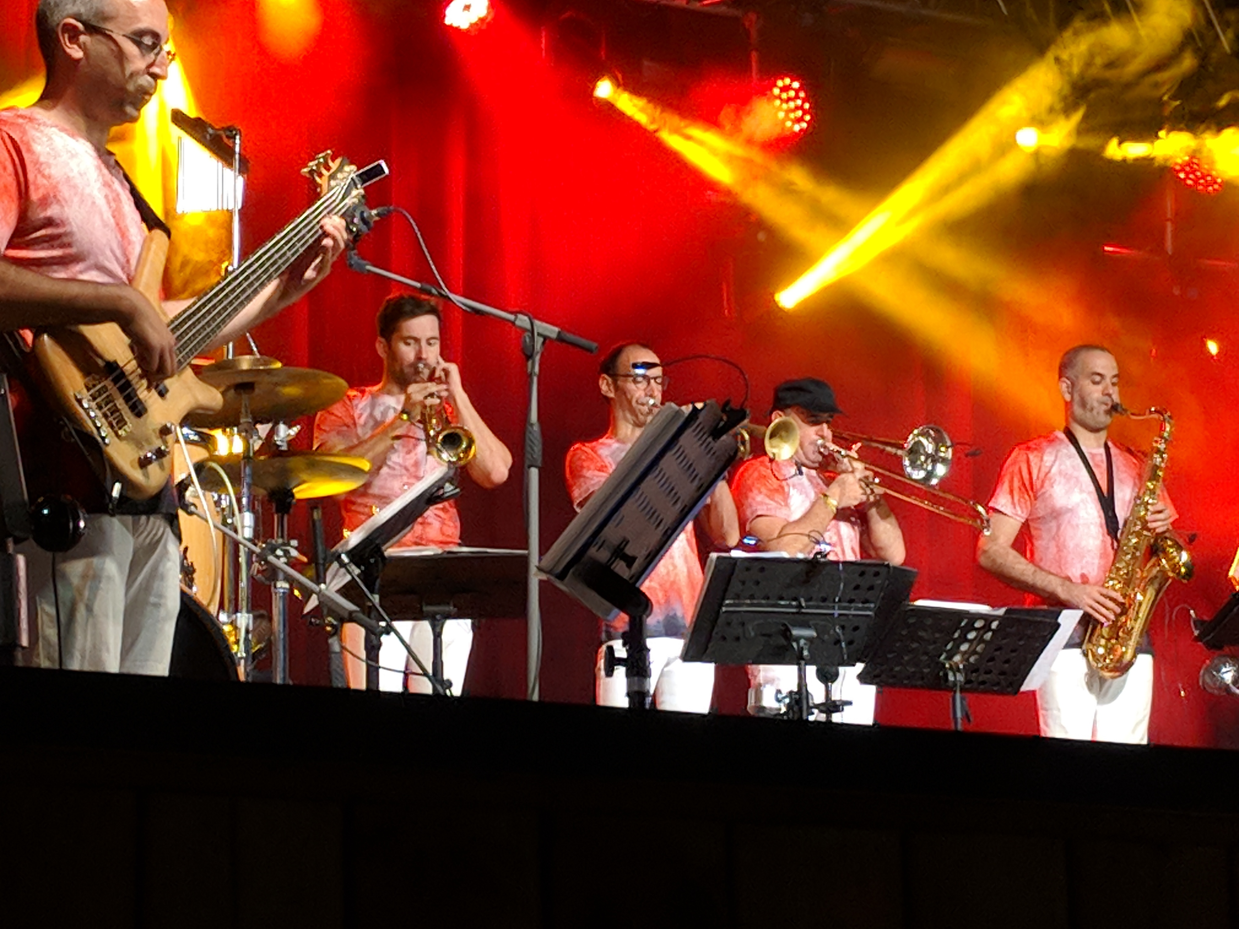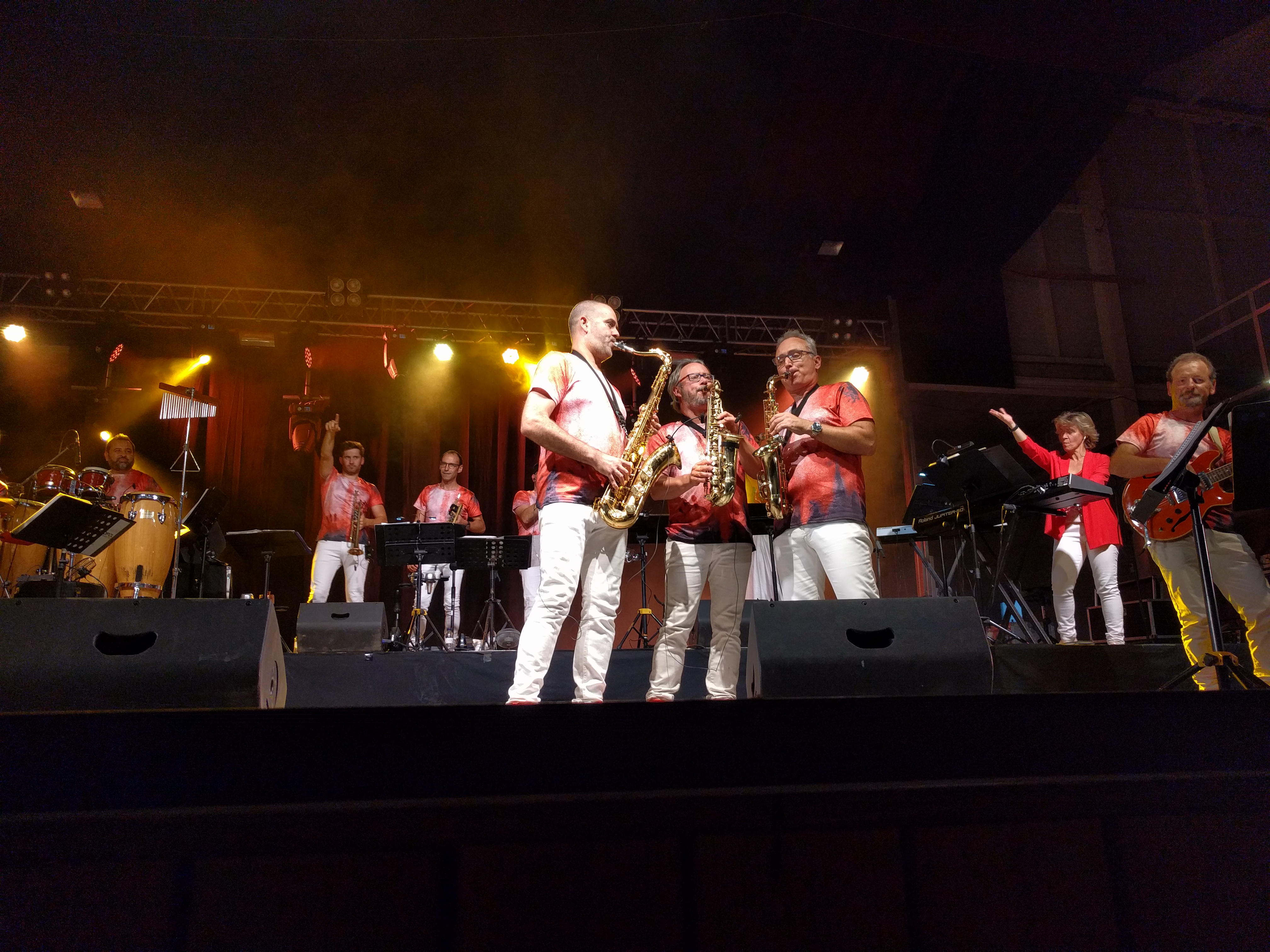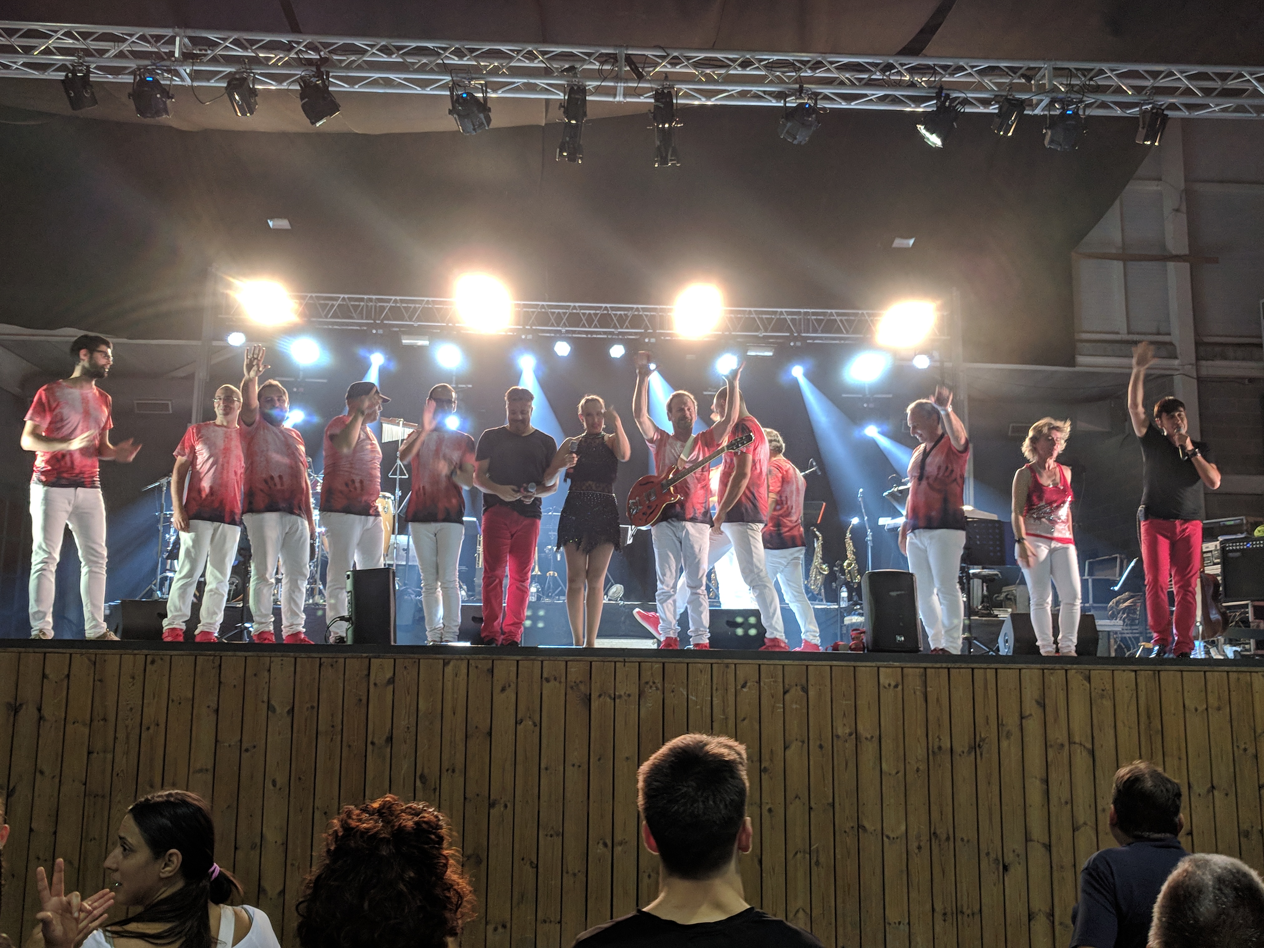 Acostumats als grans espais oberts, o a pavellons moderns, on muntem escenaris gegants, aquí no es podia fer gaire cosa, amb prou feina pots muntar l’estructura que aguanta els altaveus i els llums. I l’orquestra, acostumada a escenaris de 100 m²,  col·locada en una disposició nova i enclavadeta dalt el petit escenari 🙂