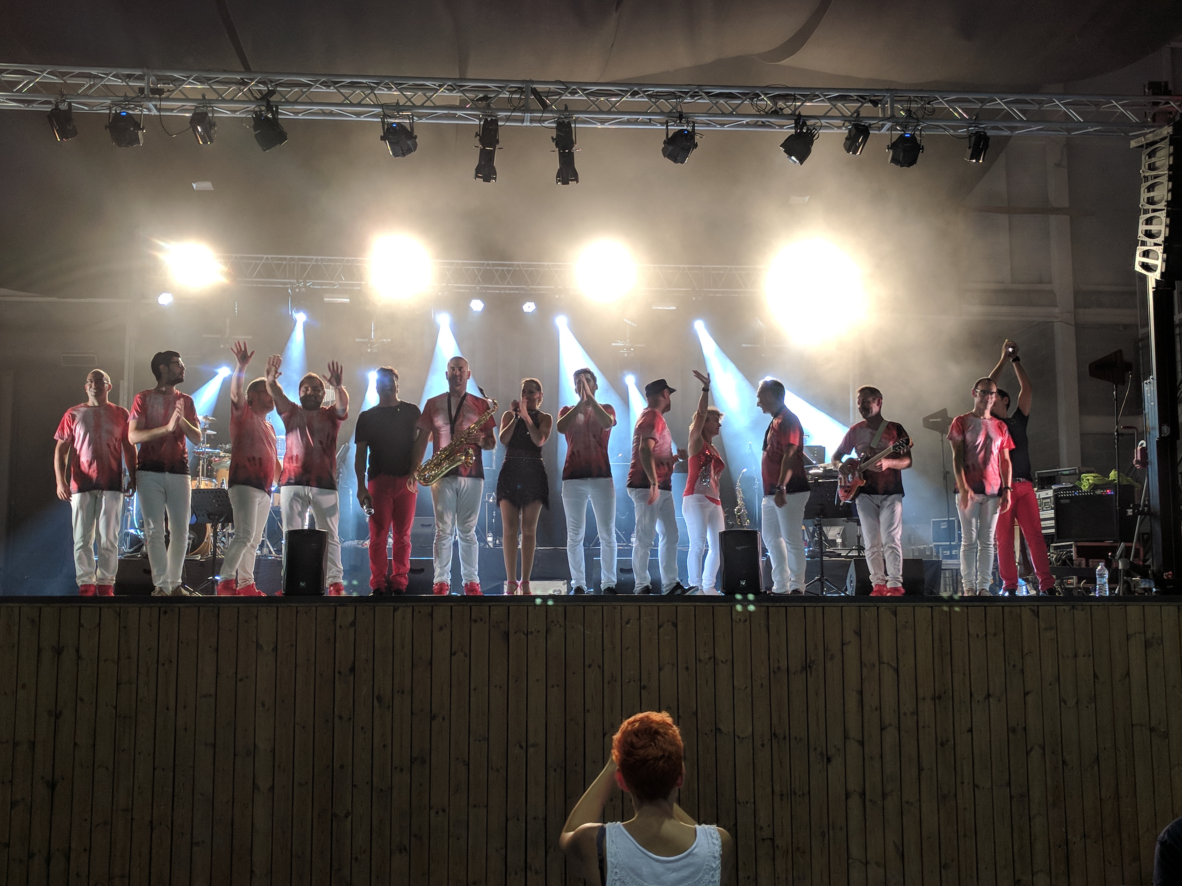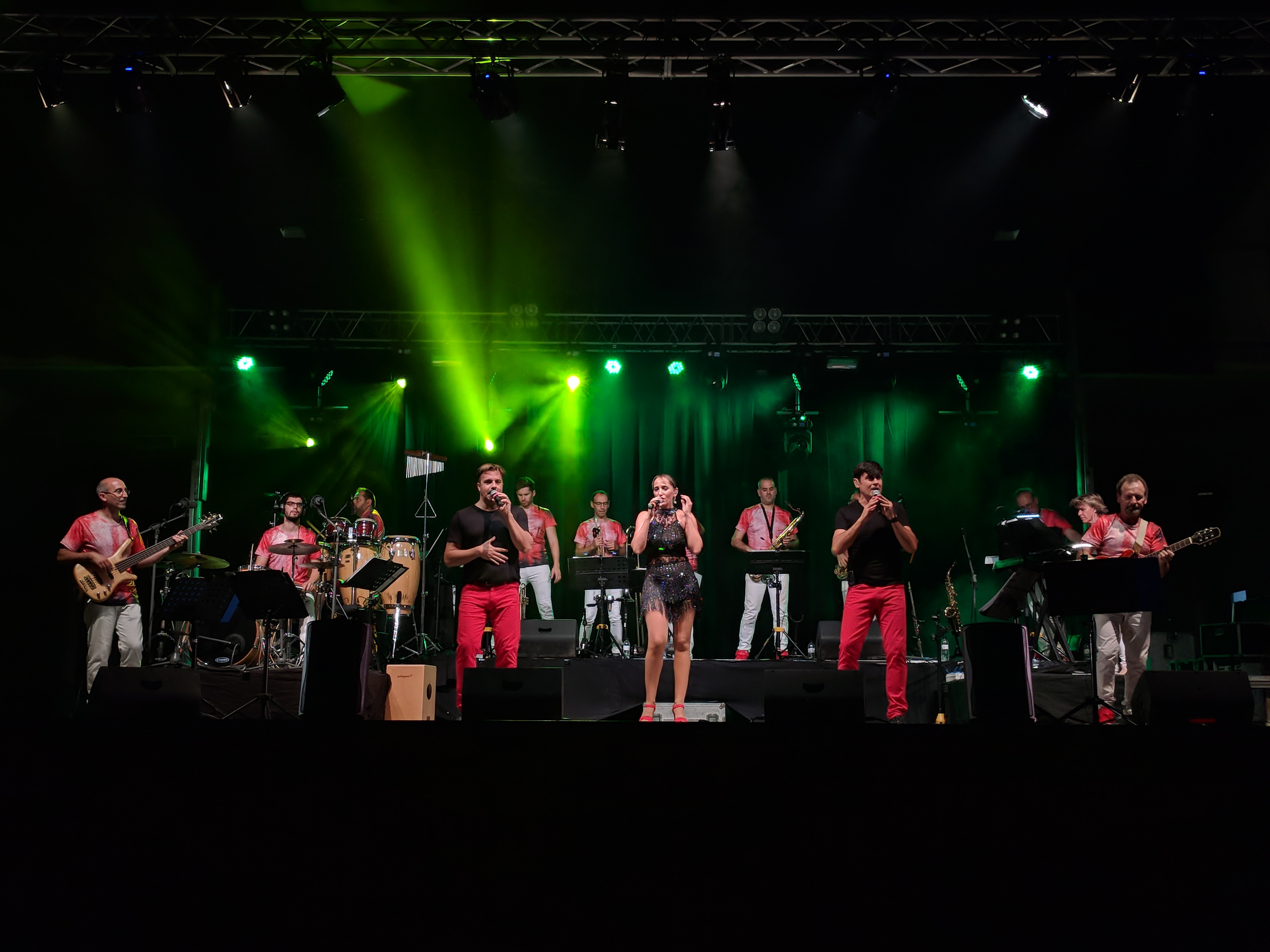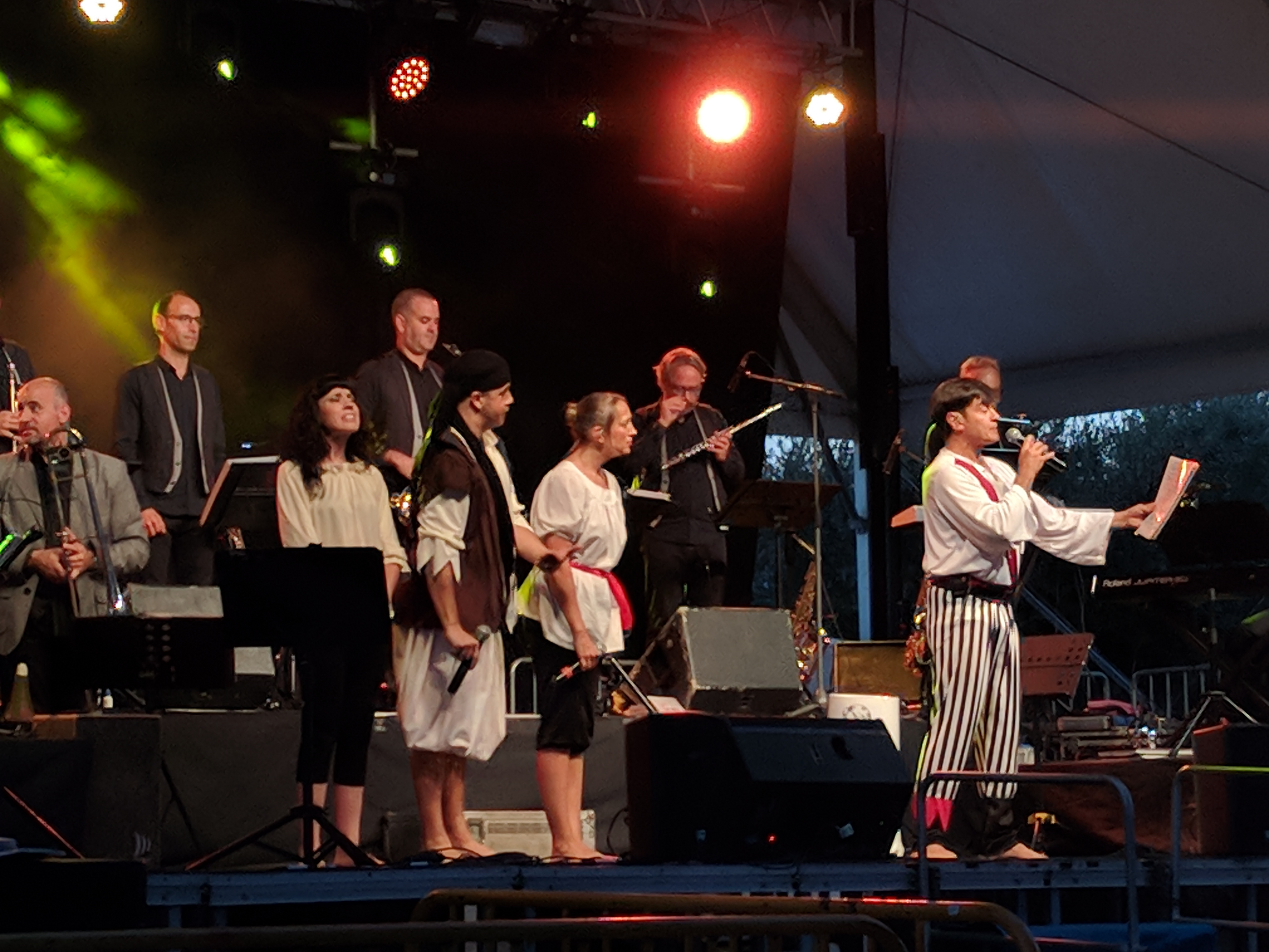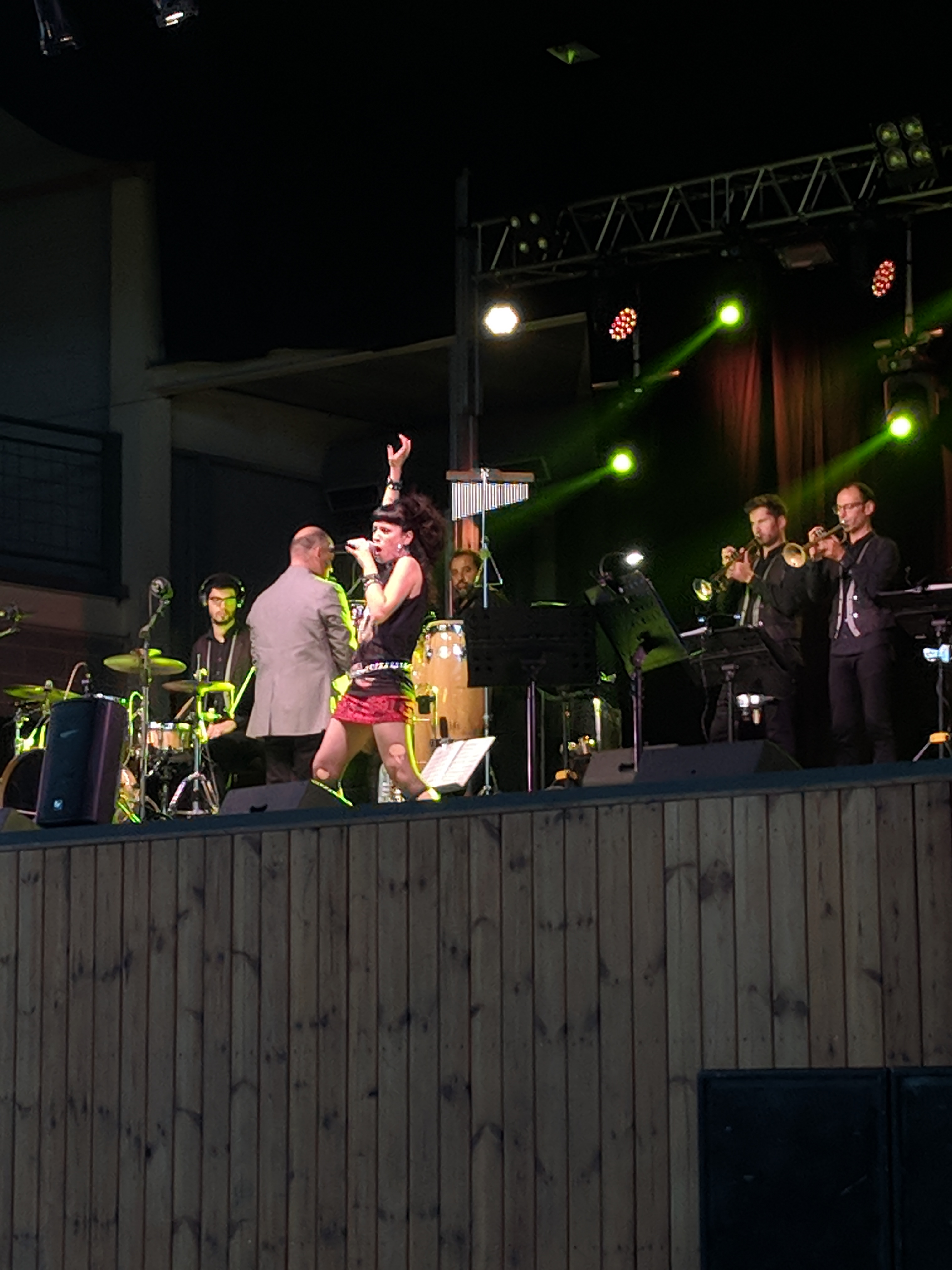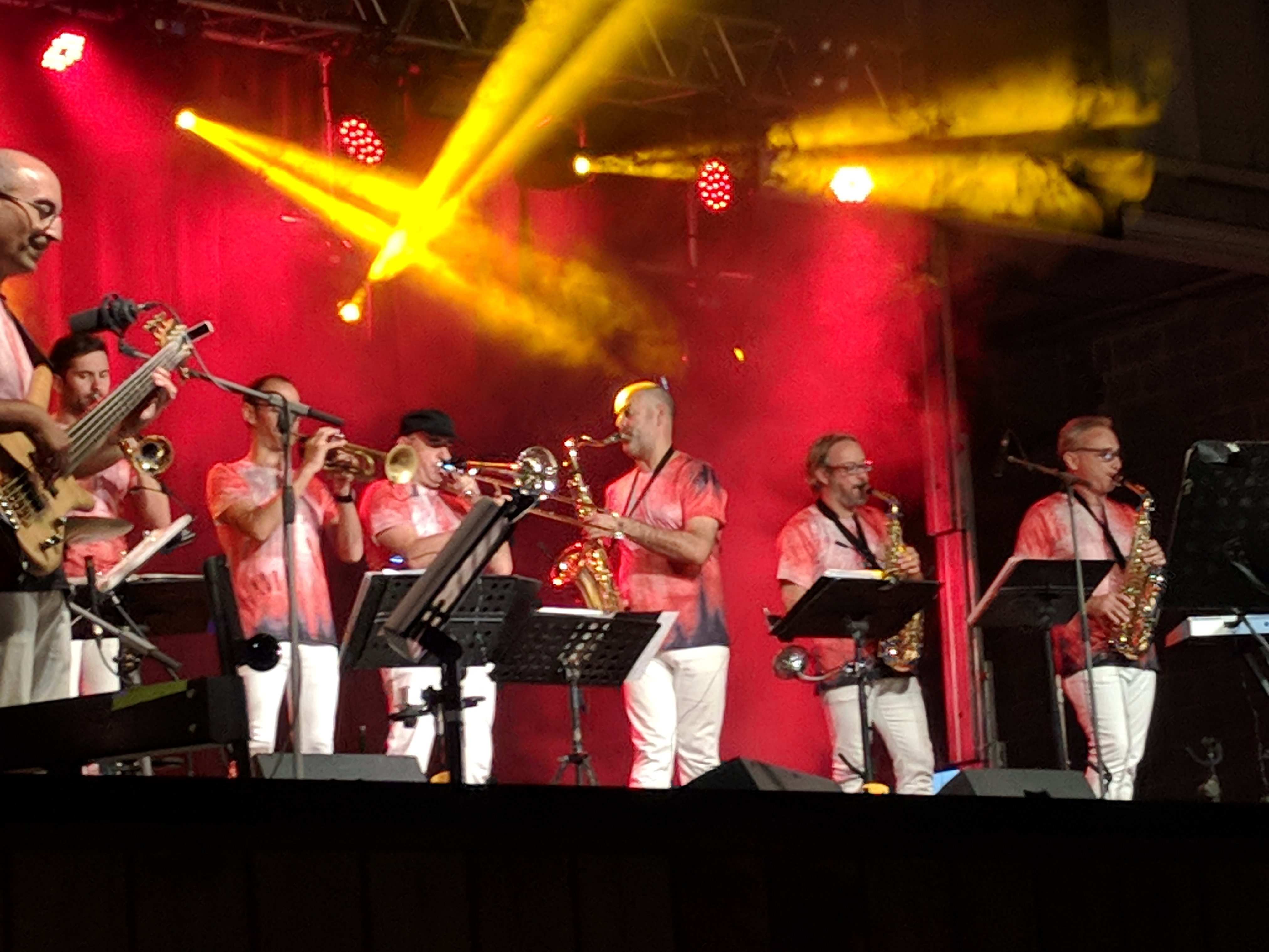 Acostumats als grans espais oberts, o a pavellons moderns, on muntem escenaris gegants, aquí no es podia fer gaire cosa, amb prou feina pots muntar l’estructura que aguanta els altaveus i els llums. I l’orquestra, acostumada a escenaris de 100 m²,  col·locada en una disposició nova i enclavadeta dalt el petit escenari 🙂
