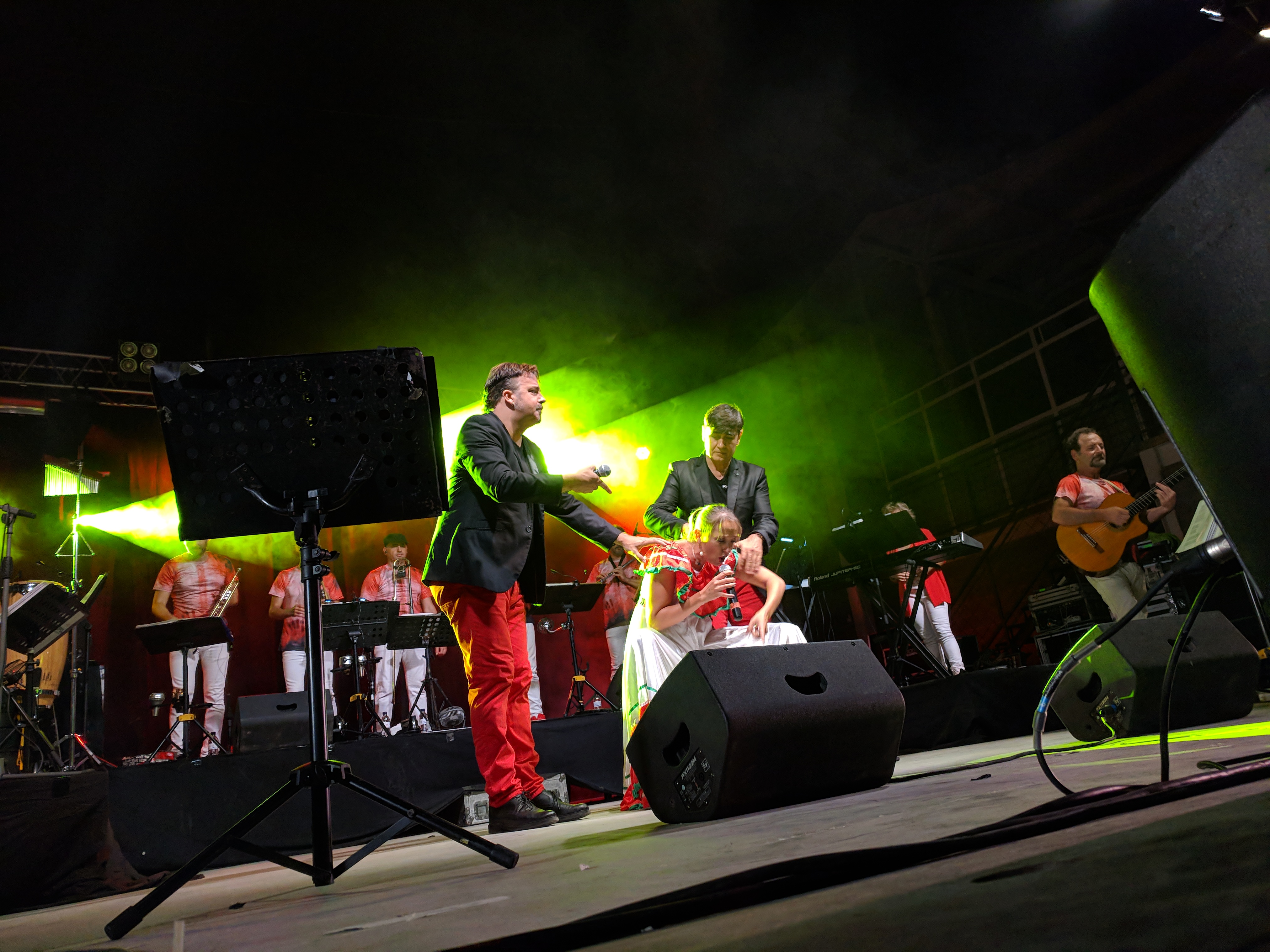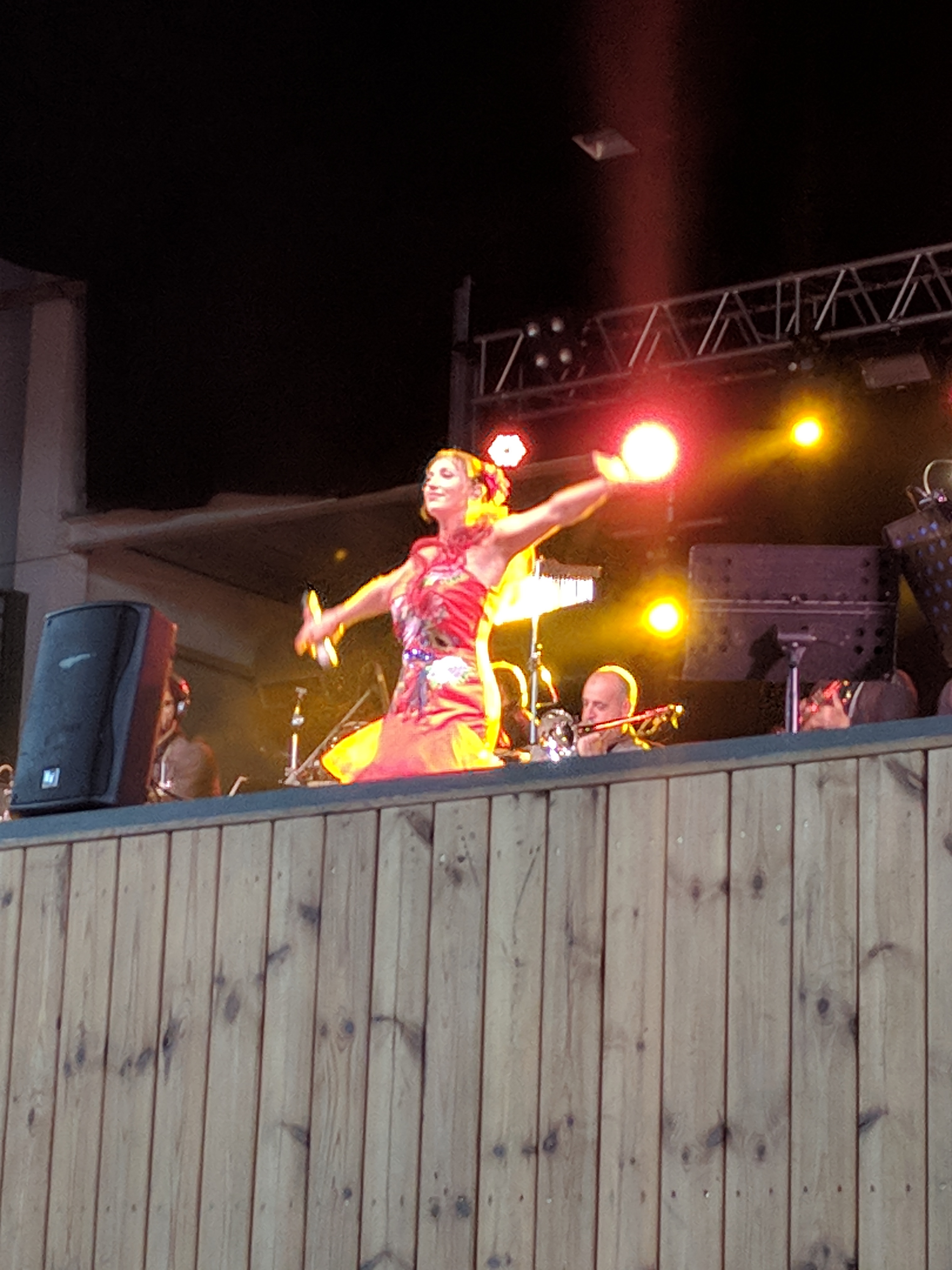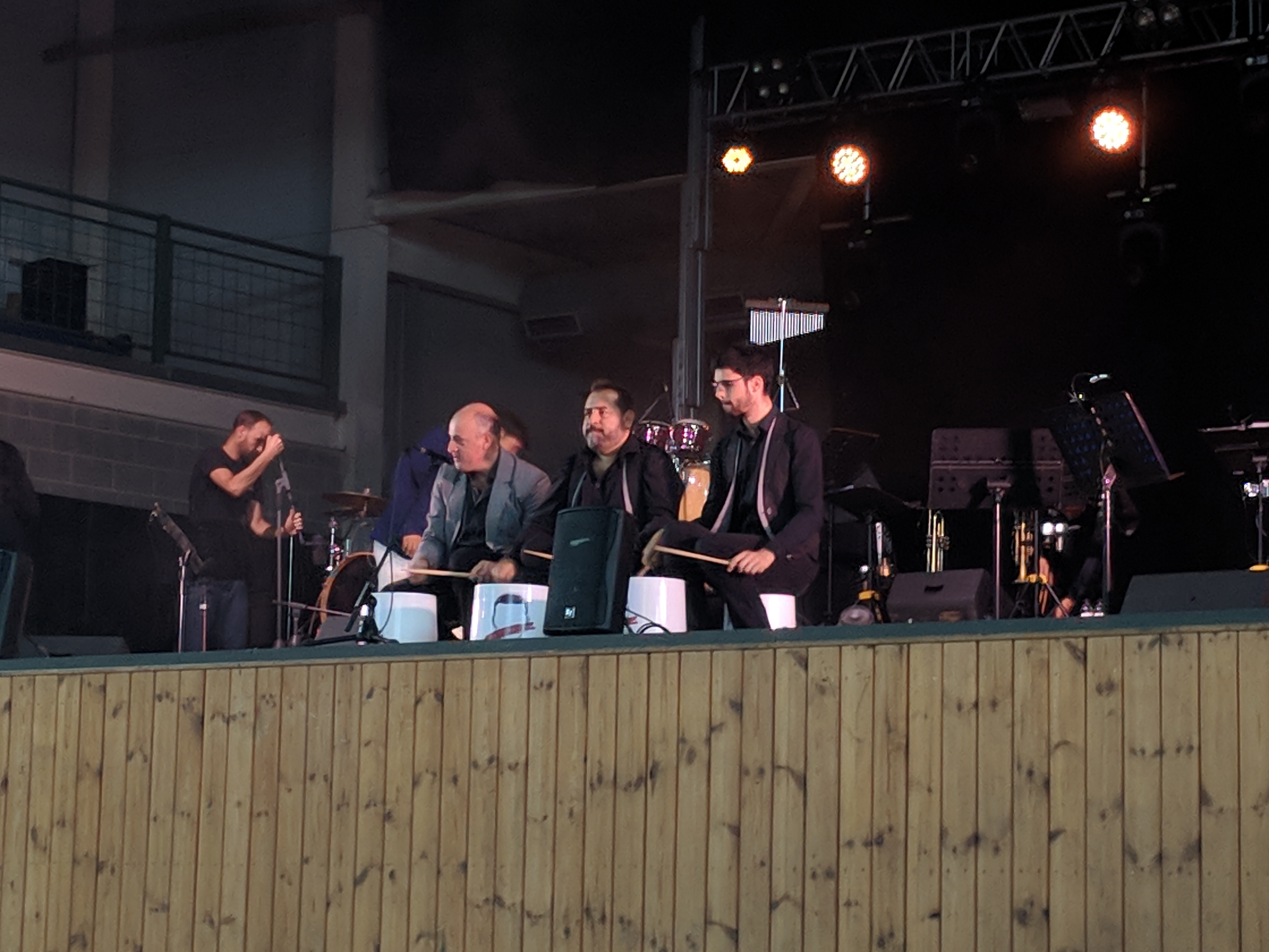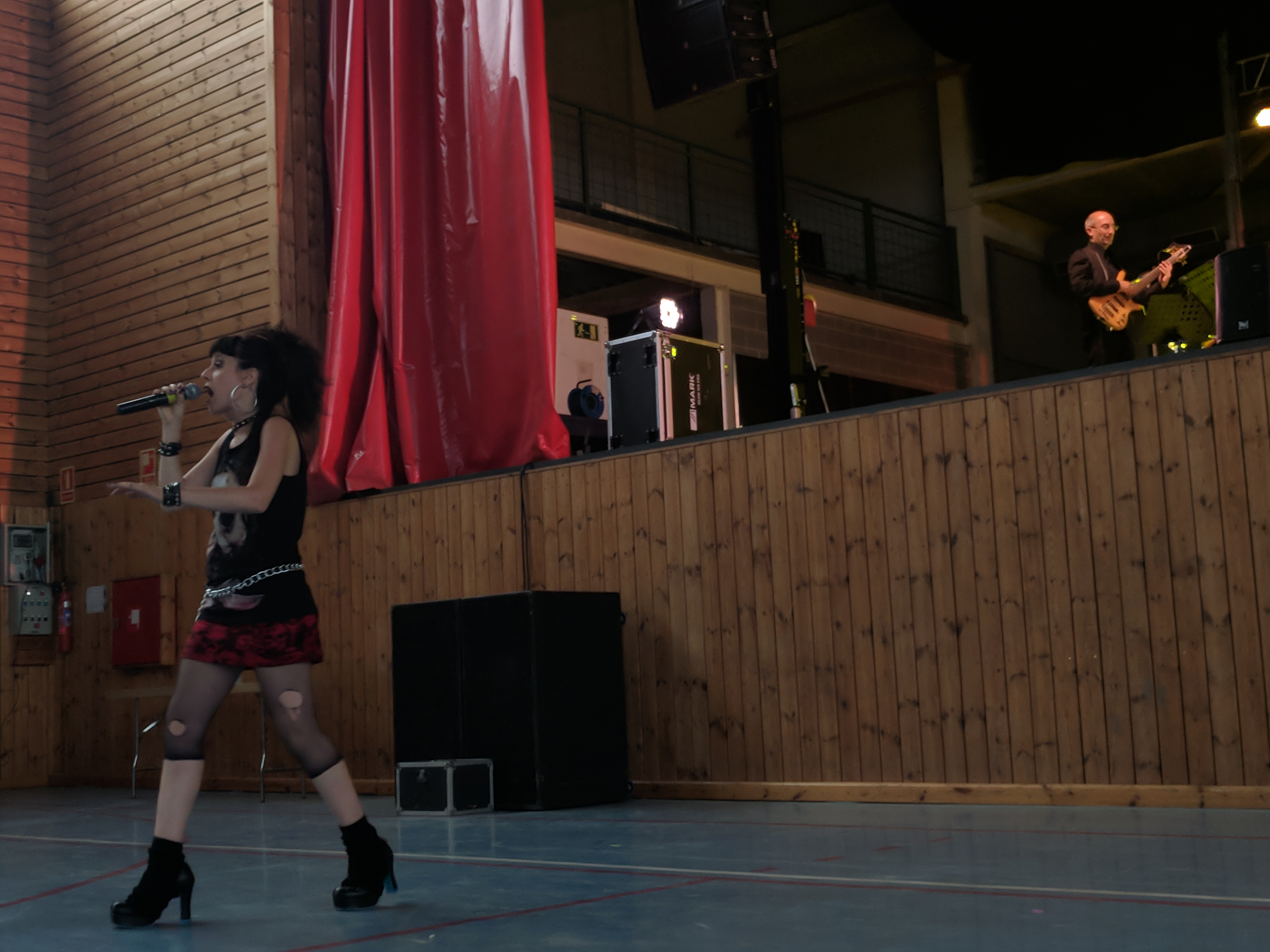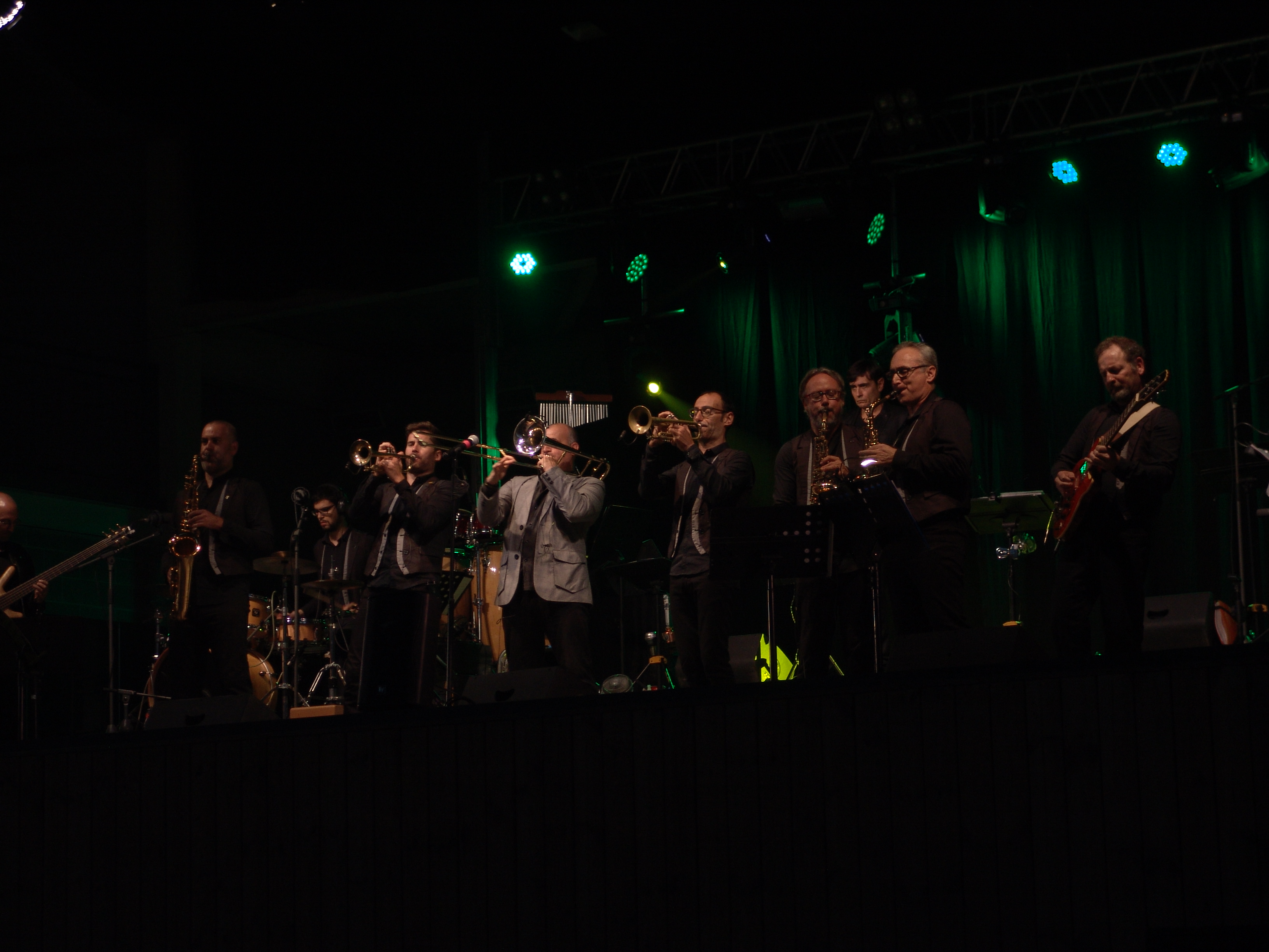 Acostumats als grans espais oberts, o a pavellons moderns, on muntem escenaris gegants, aquí no es podia fer gaire cosa, amb prou feina pots muntar l’estructura que aguanta els altaveus i els llums. I l’orquestra, acostumada a escenaris de 100 m²,  col·locada en una disposició nova i enclavadeta dalt el petit escenari 🙂