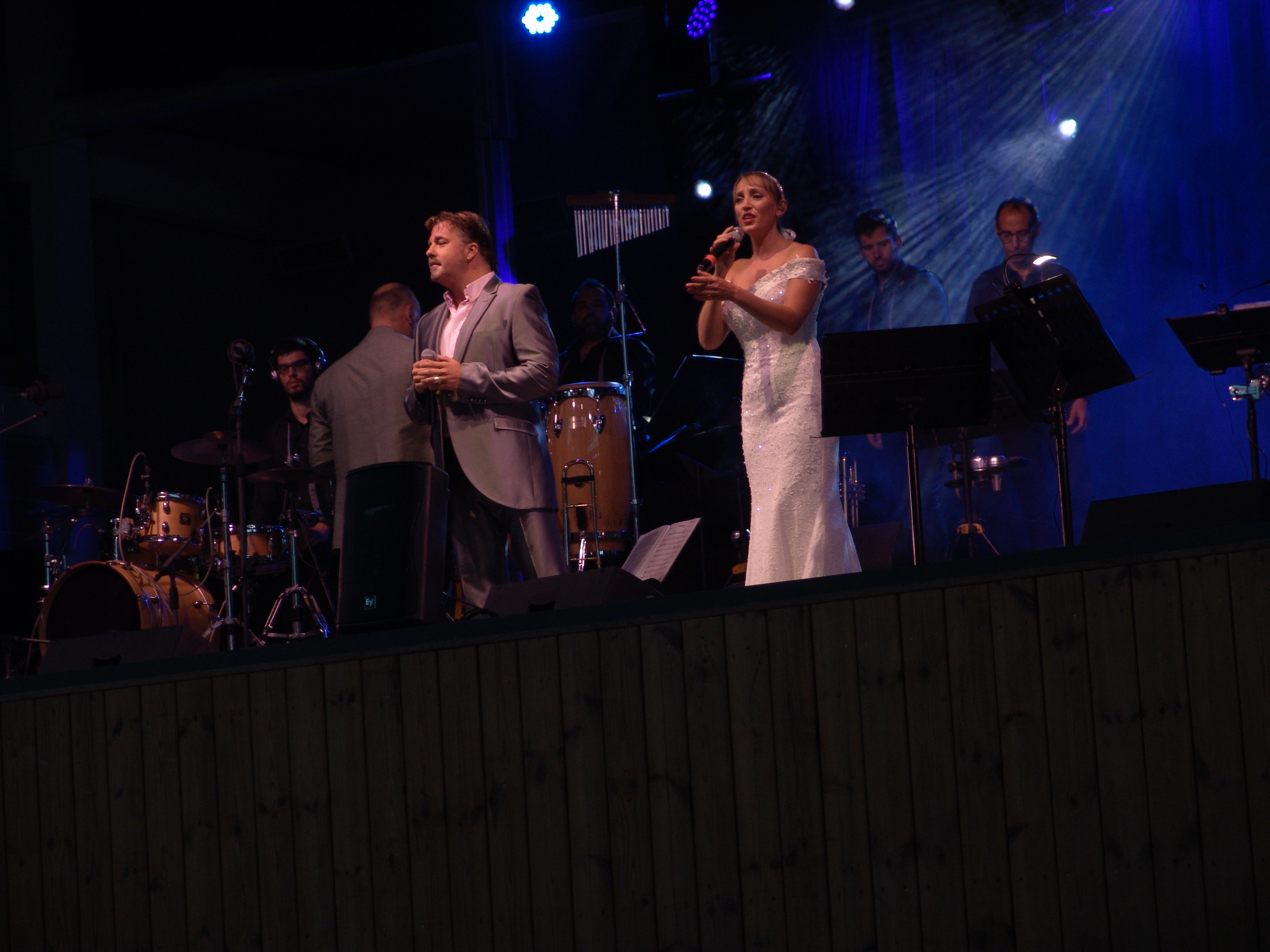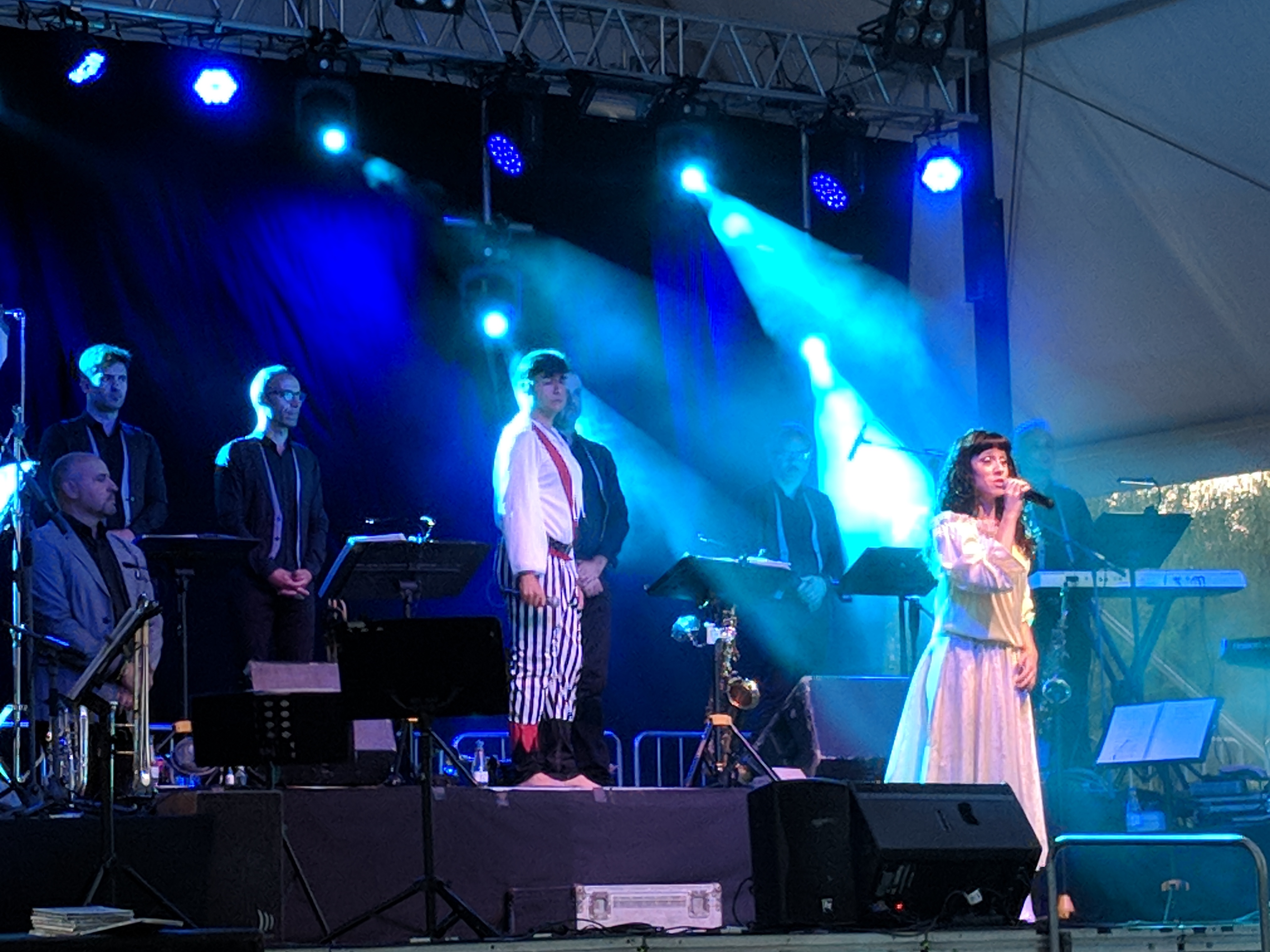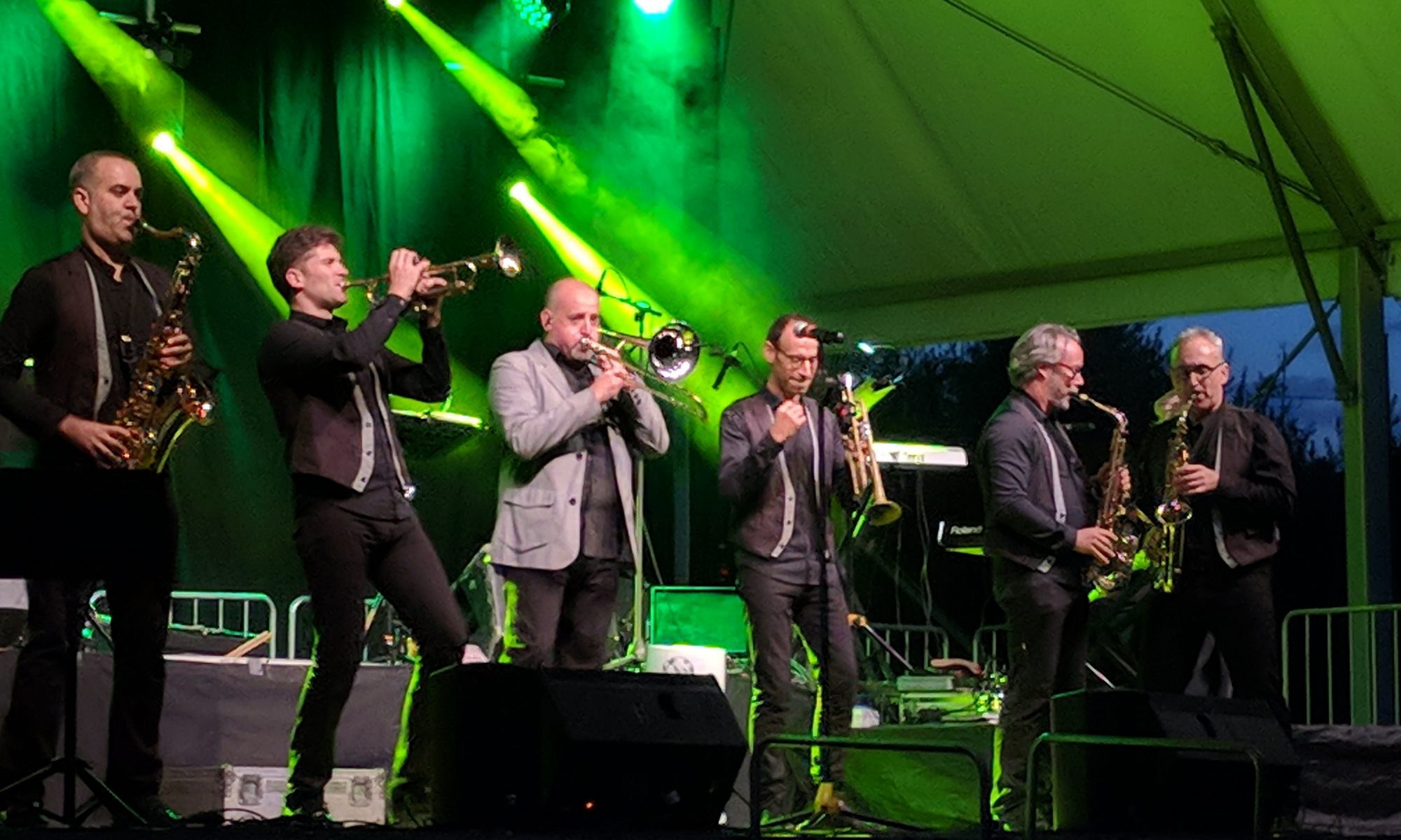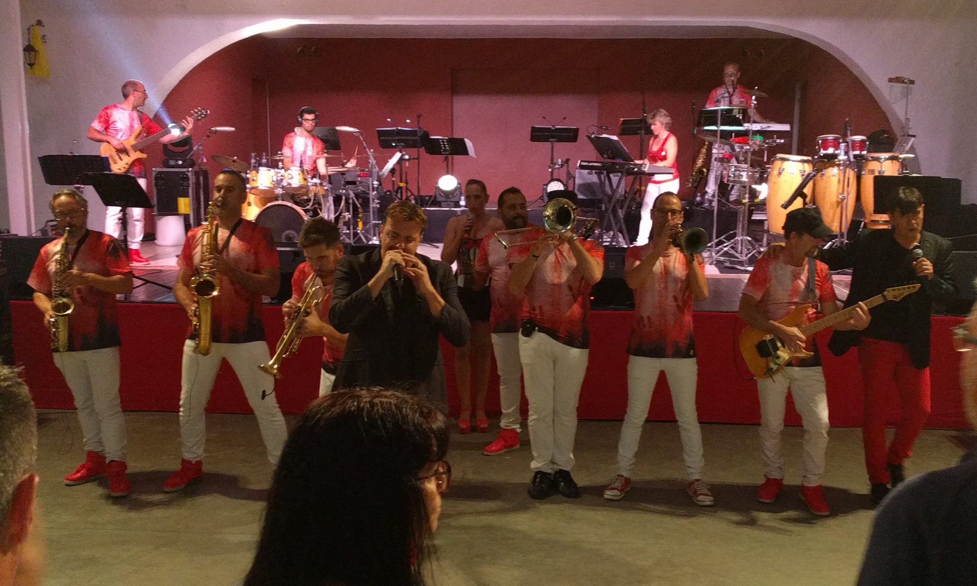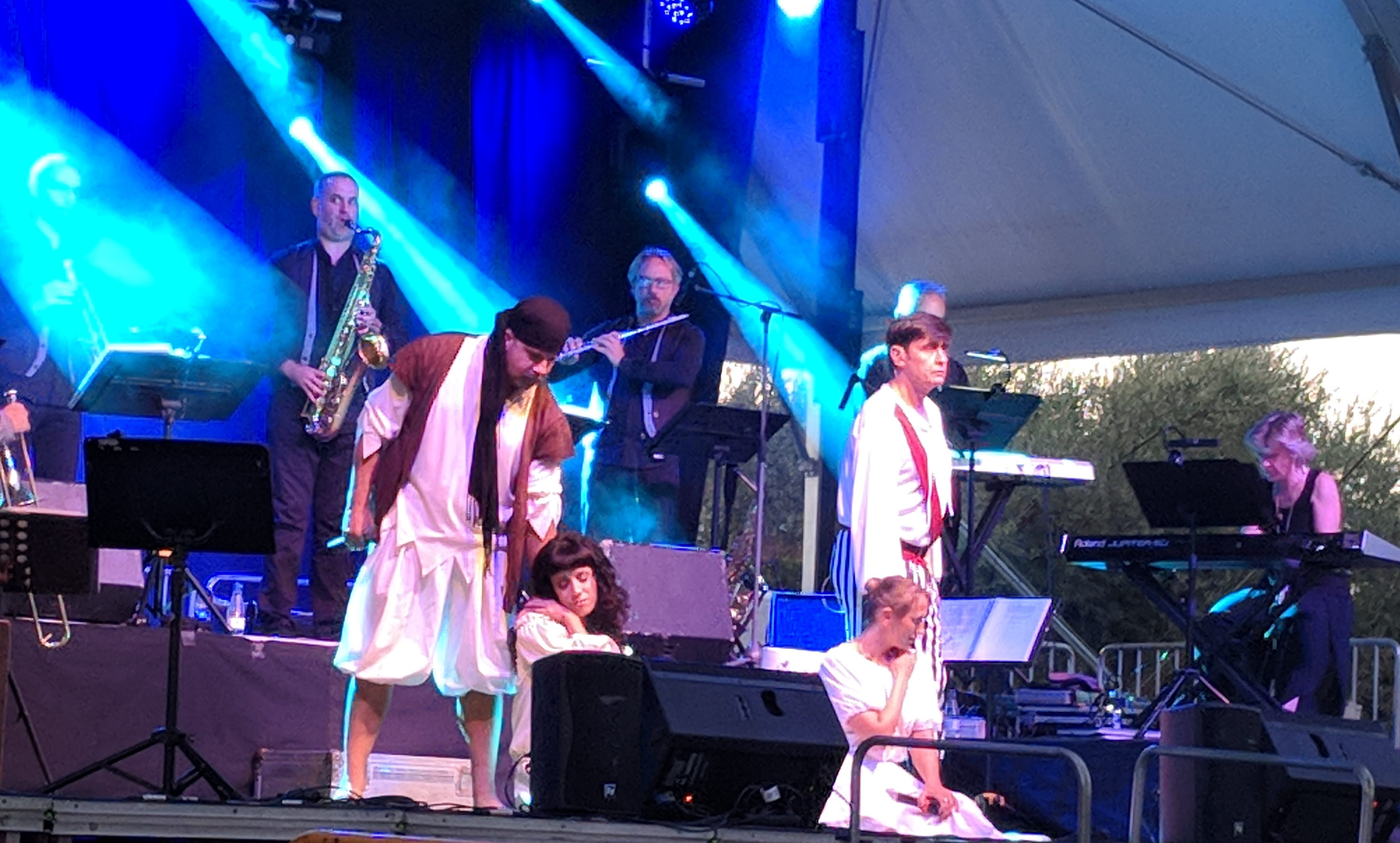 Acostumats als grans espais oberts, o a pavellons moderns, on muntem escenaris gegants, aquí no es podia fer gaire cosa, amb prou feina pots muntar l’estructura que aguanta els altaveus i els llums. I l’orquestra, acostumada a escenaris de 100 m²,  col·locada en una disposició nova i enclavadeta dalt el petit escenari 🙂