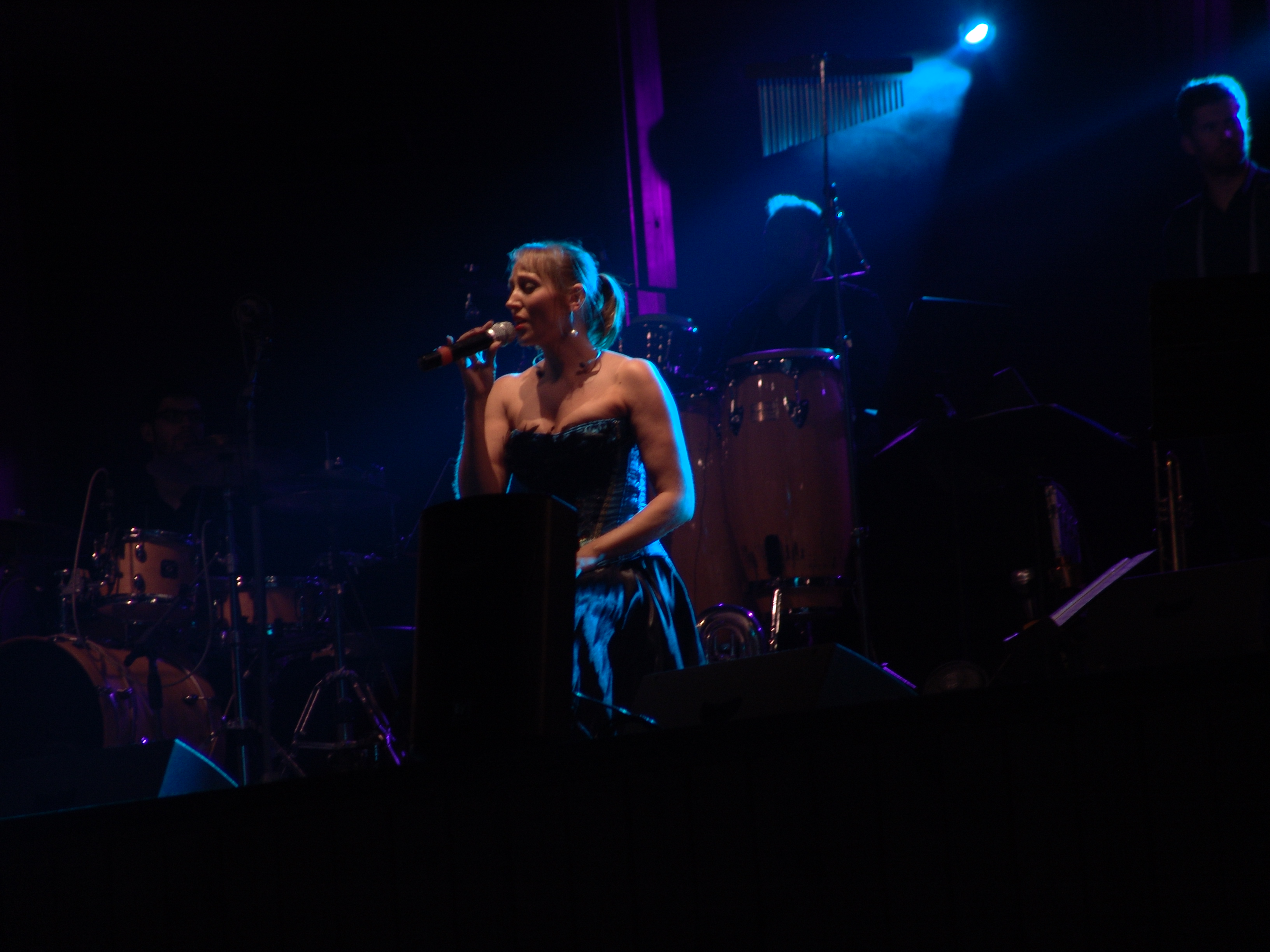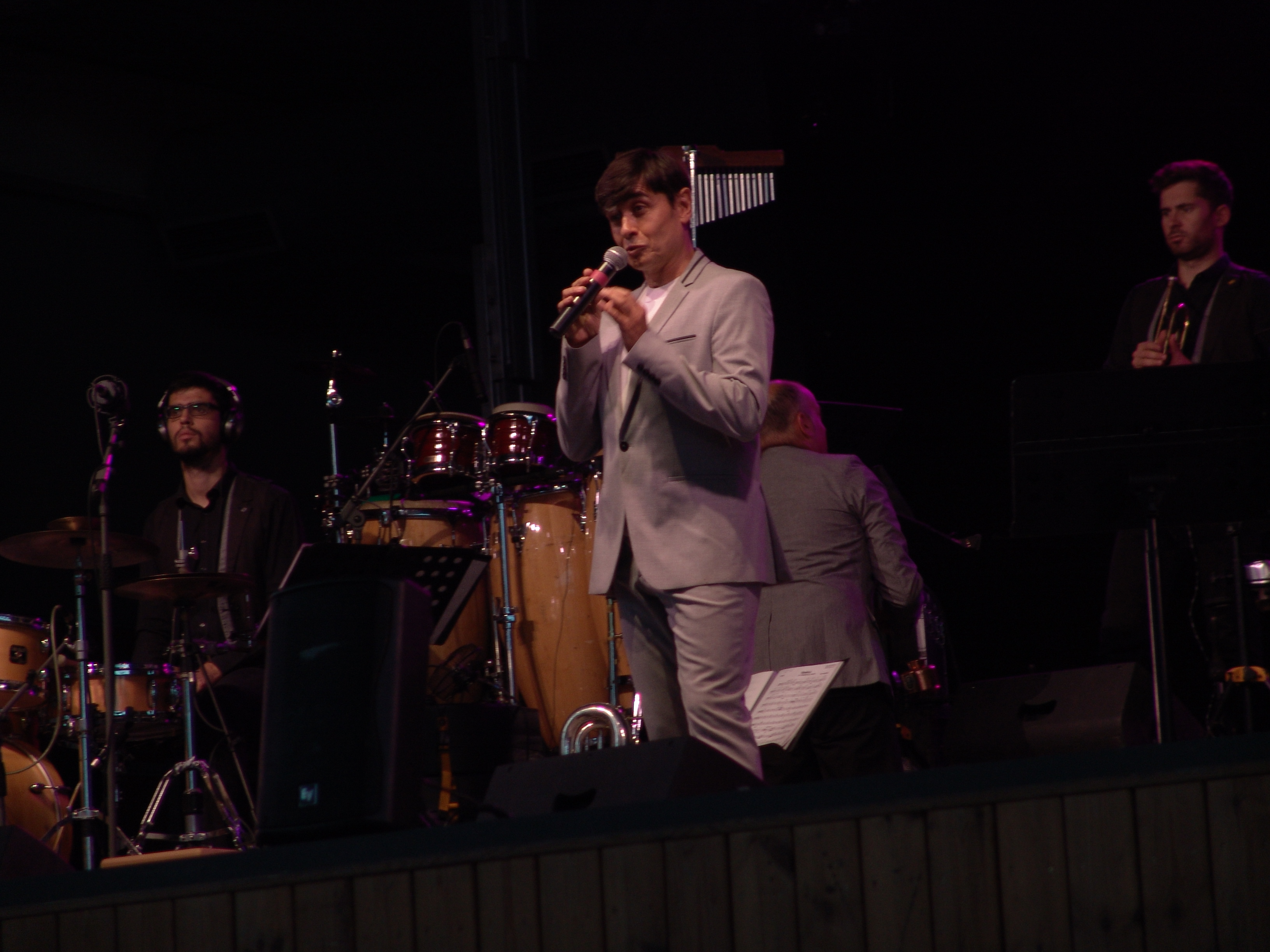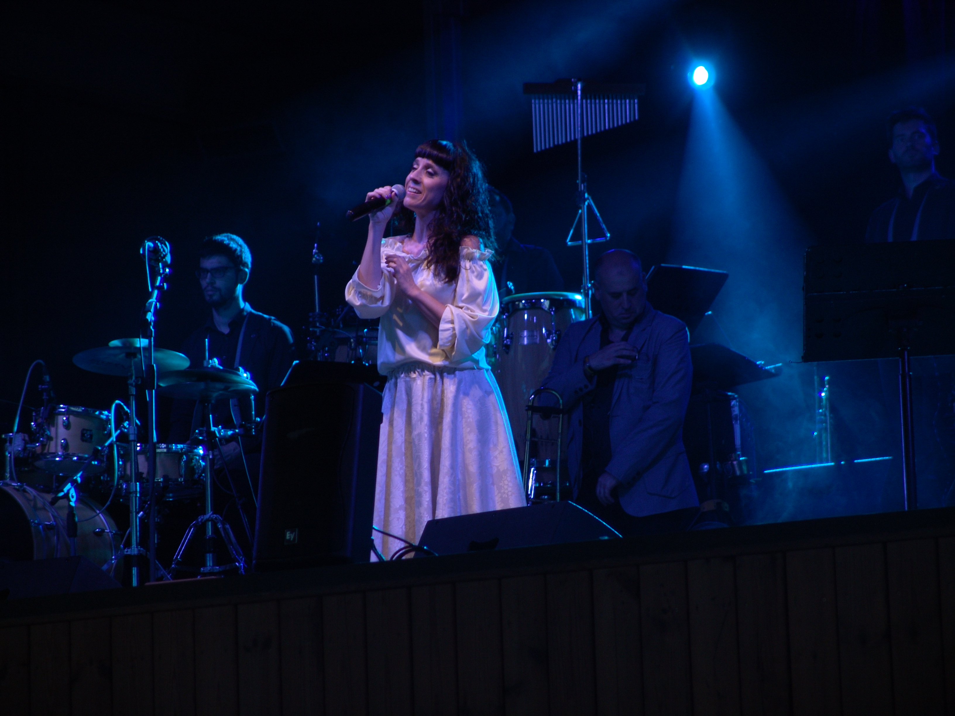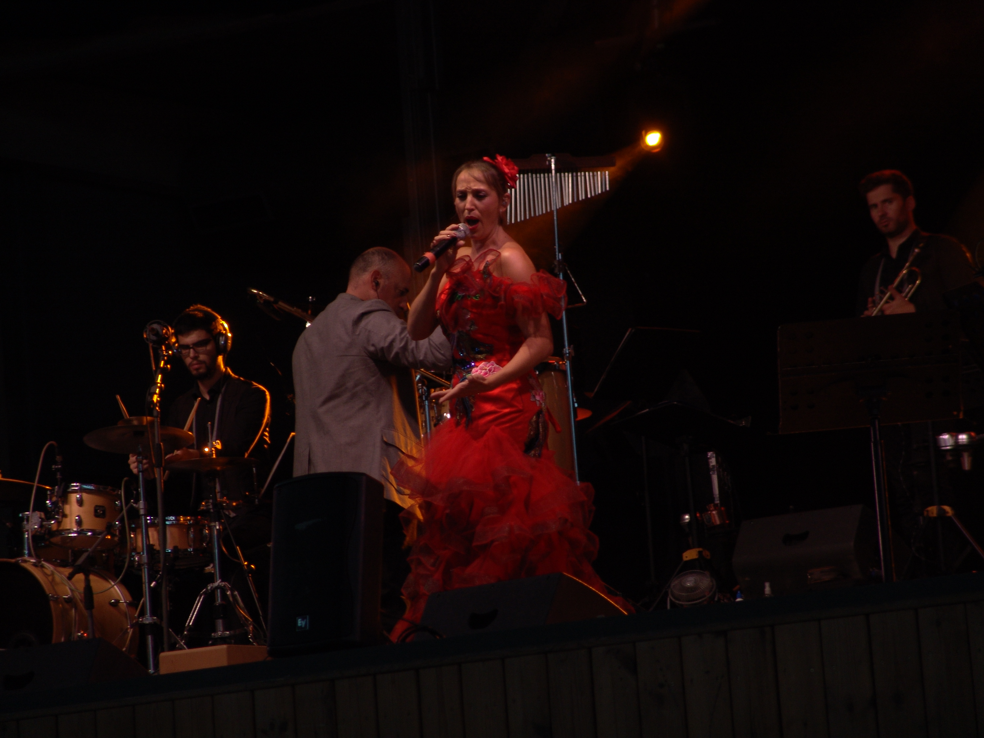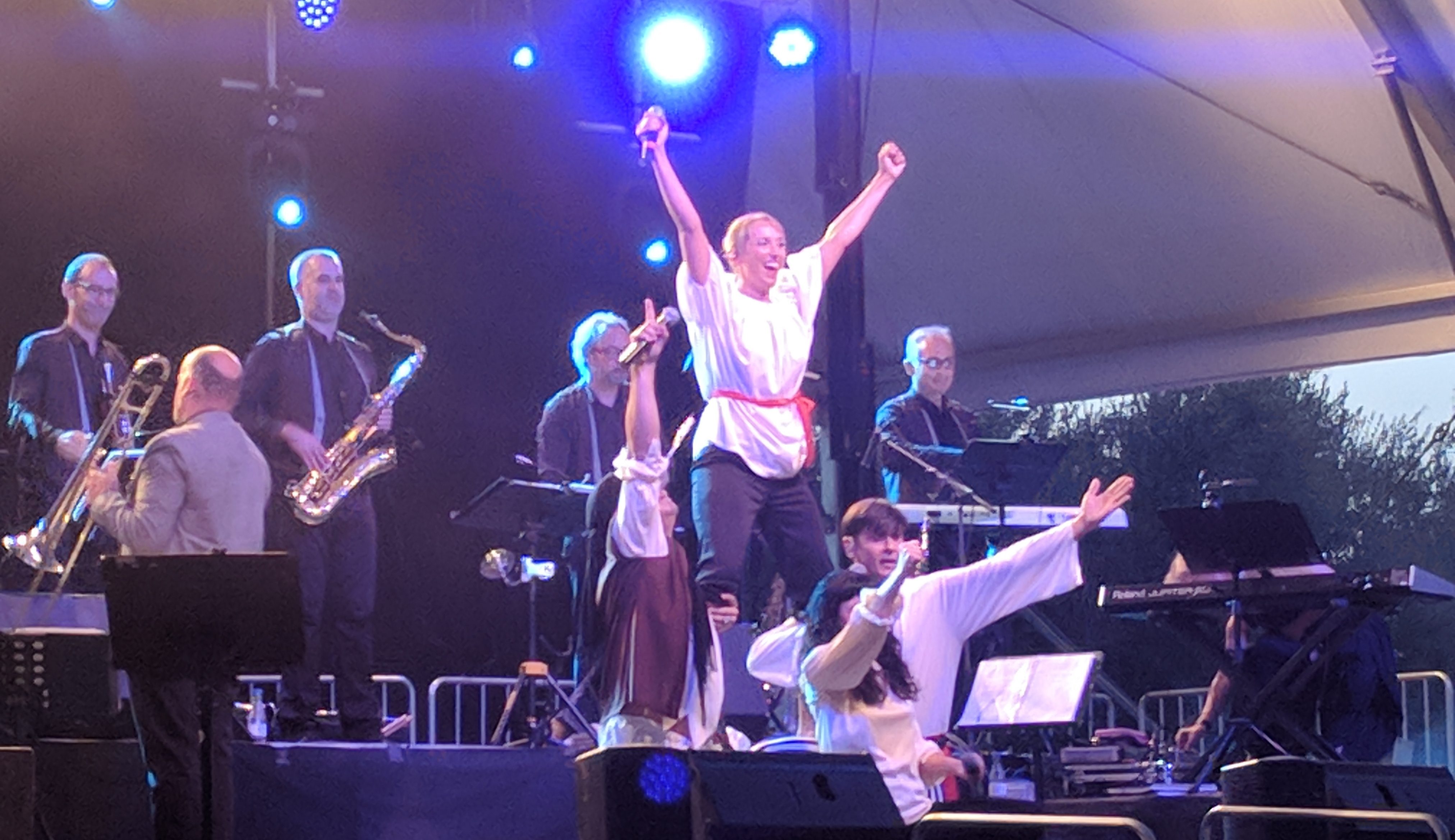 Acostumats als grans espais oberts, o a pavellons moderns, on muntem escenaris gegants, aquí no es podia fer gaire cosa, amb prou feina pots muntar l’estructura que aguanta els altaveus i els llums. I l’orquestra, acostumada a escenaris de 100 m²,  col·locada en una disposició nova i enclavadeta dalt el petit escenari 🙂